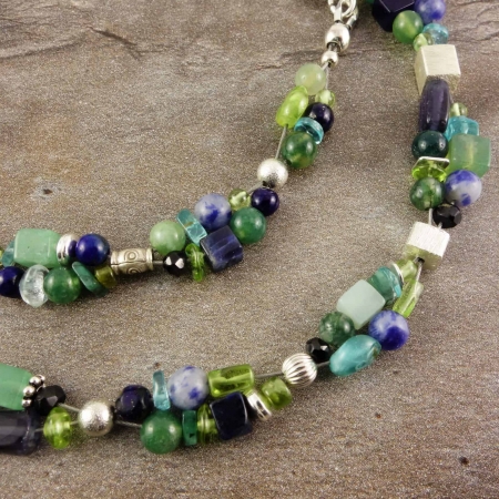 • Edelsteinkette in blau/grün mit 925er Silber, zweireihig