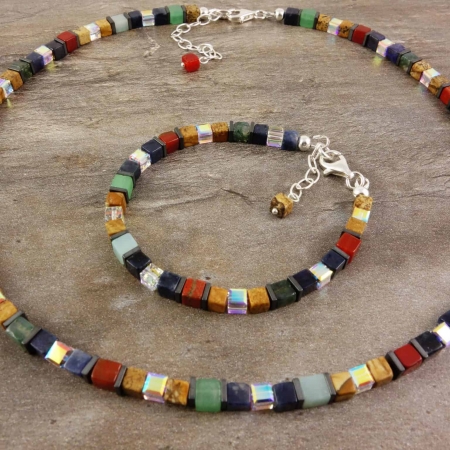 • Bunte Edelsteinkette mit 925er Silber, zweireihig