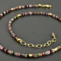 Edle Kette mit wunderschönen 3 mm großen Turmalinscheiben, die von vergoldeten 925er Silberscheiben und Kugeln unterbrochen werden.