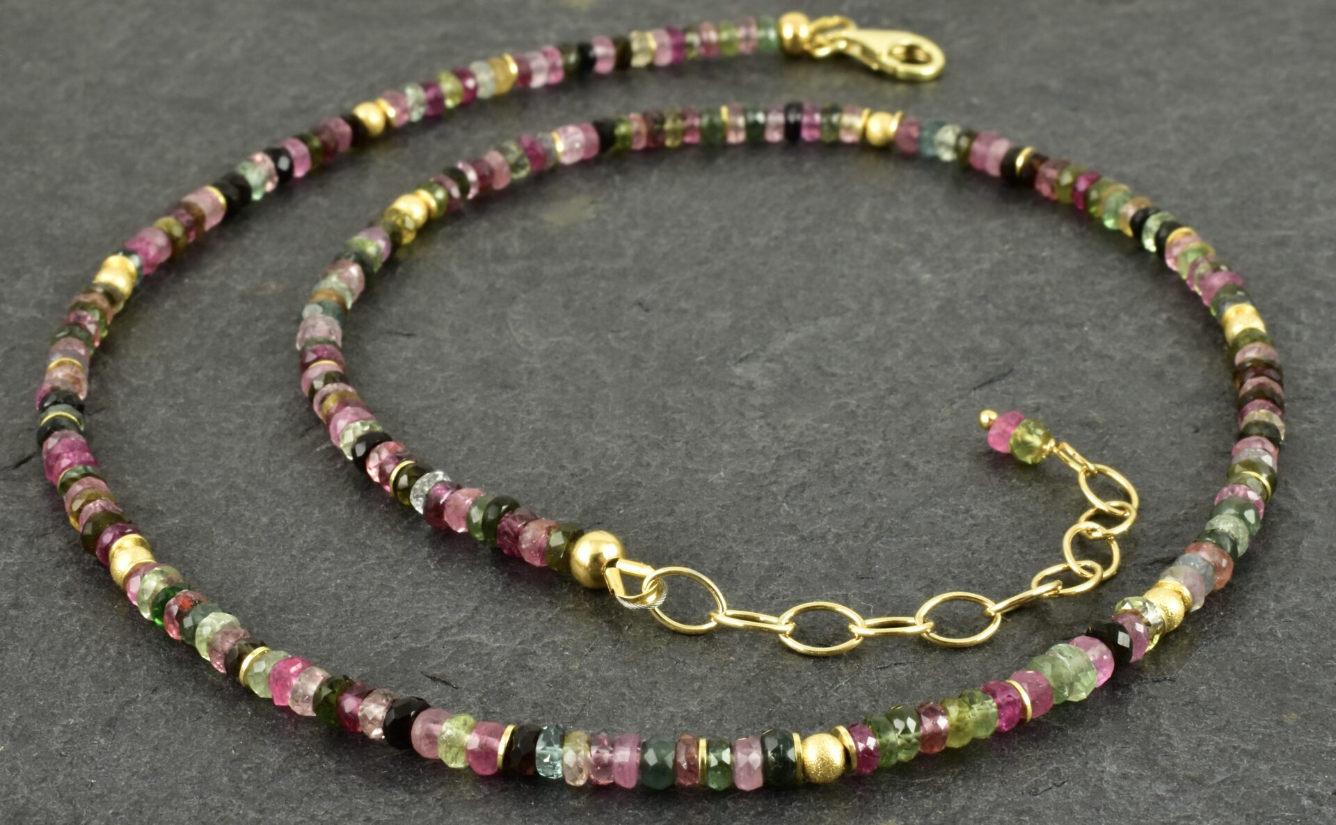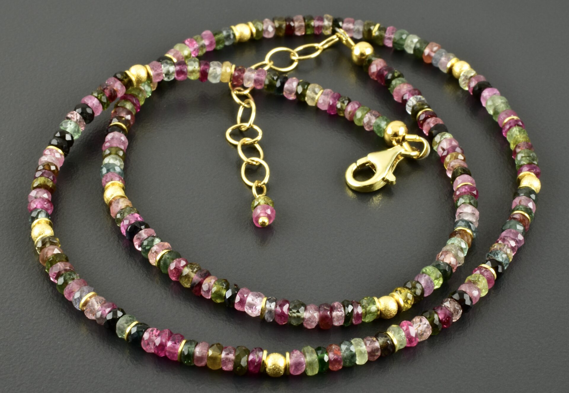 Edle Kette mit wunderschönen 3 mm großen Turmalinscheiben, die von vergoldeten 925er Silberscheiben und Kugeln unterbrochen werden.