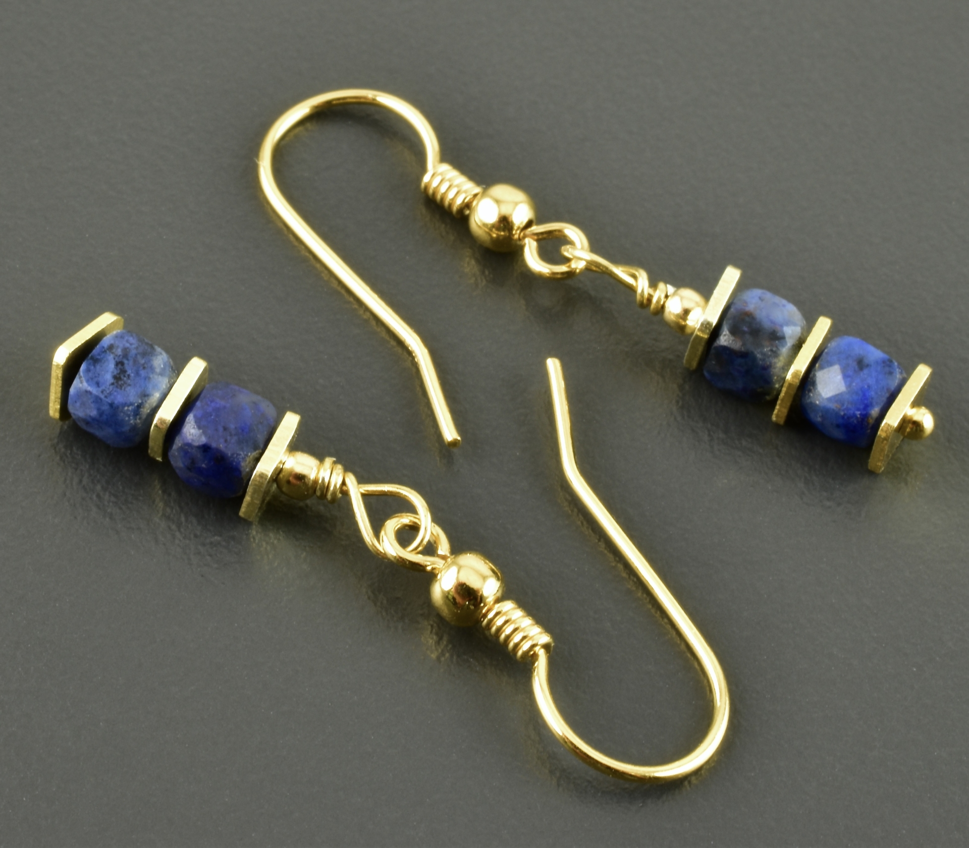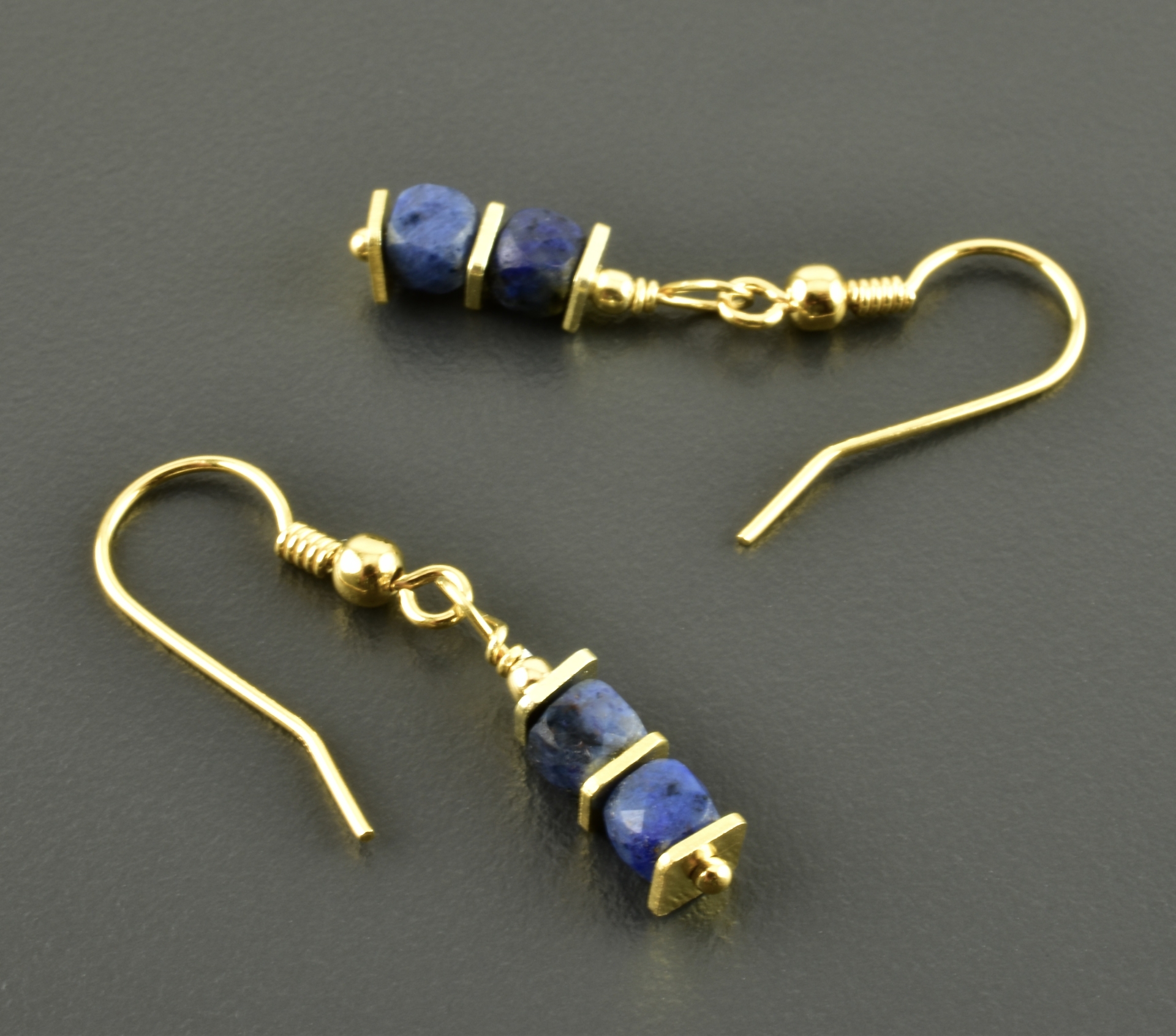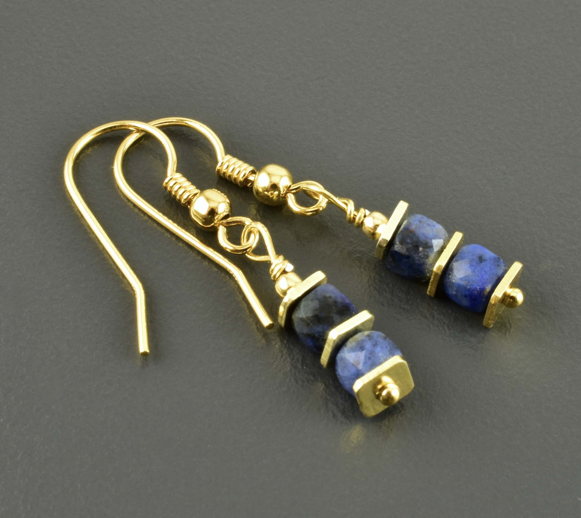 Die Steine sind facettiert, leider lässt sich das auf den Fotos nicht so gut einfangen. Zusätzlich habe ich vergoldete 925er Silber-Scheiben zwischen den Dumortierit gesetzt. Ein Ohrhaken vollendet das Design.