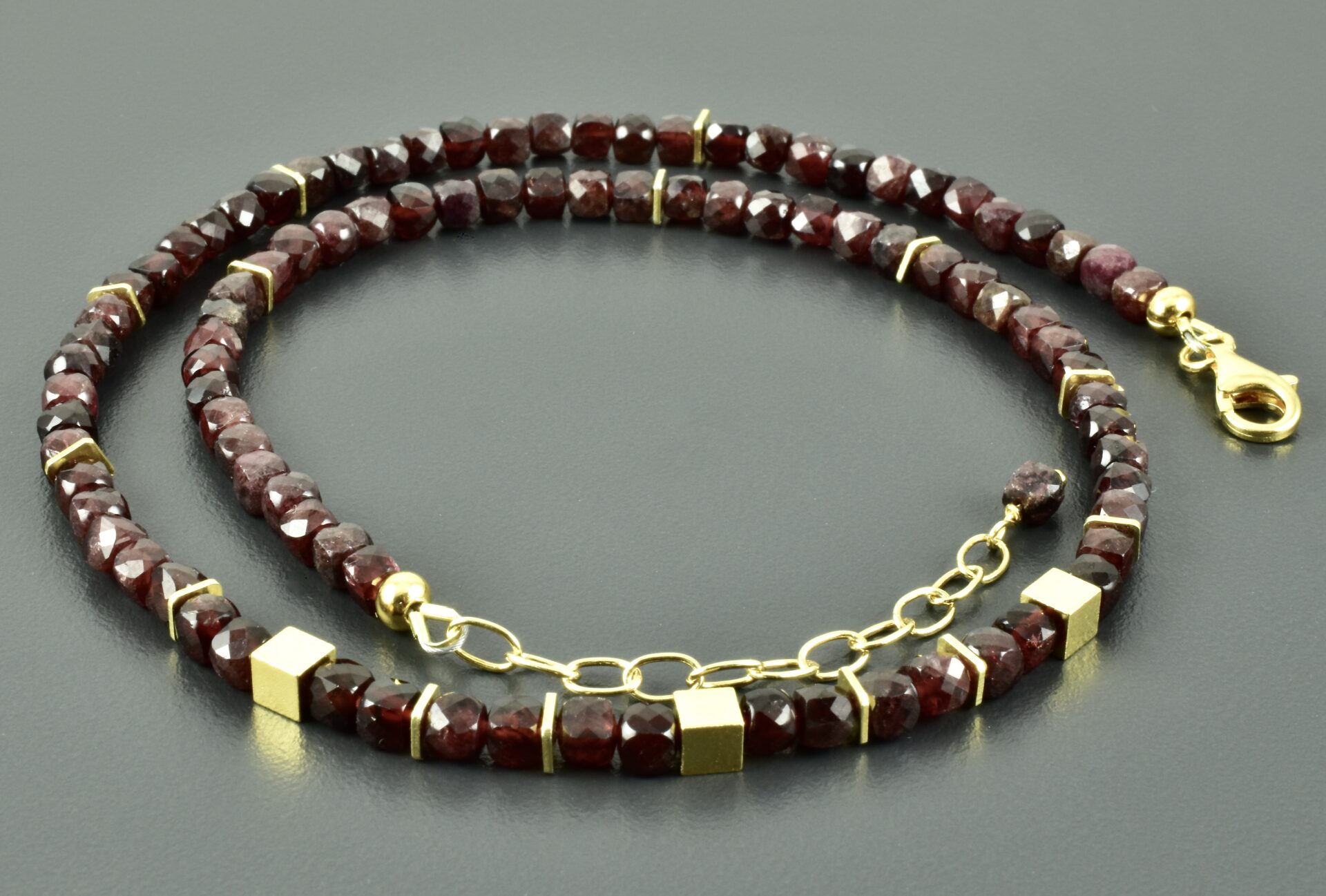 Zarte Edelstein-Kette mit 3,5 mm facettierten, dunkelroten Granat-Würfeln. Der Granat wird unterbrochen von Würfeln und Scheiben aus vergoldetem 925er Silber.