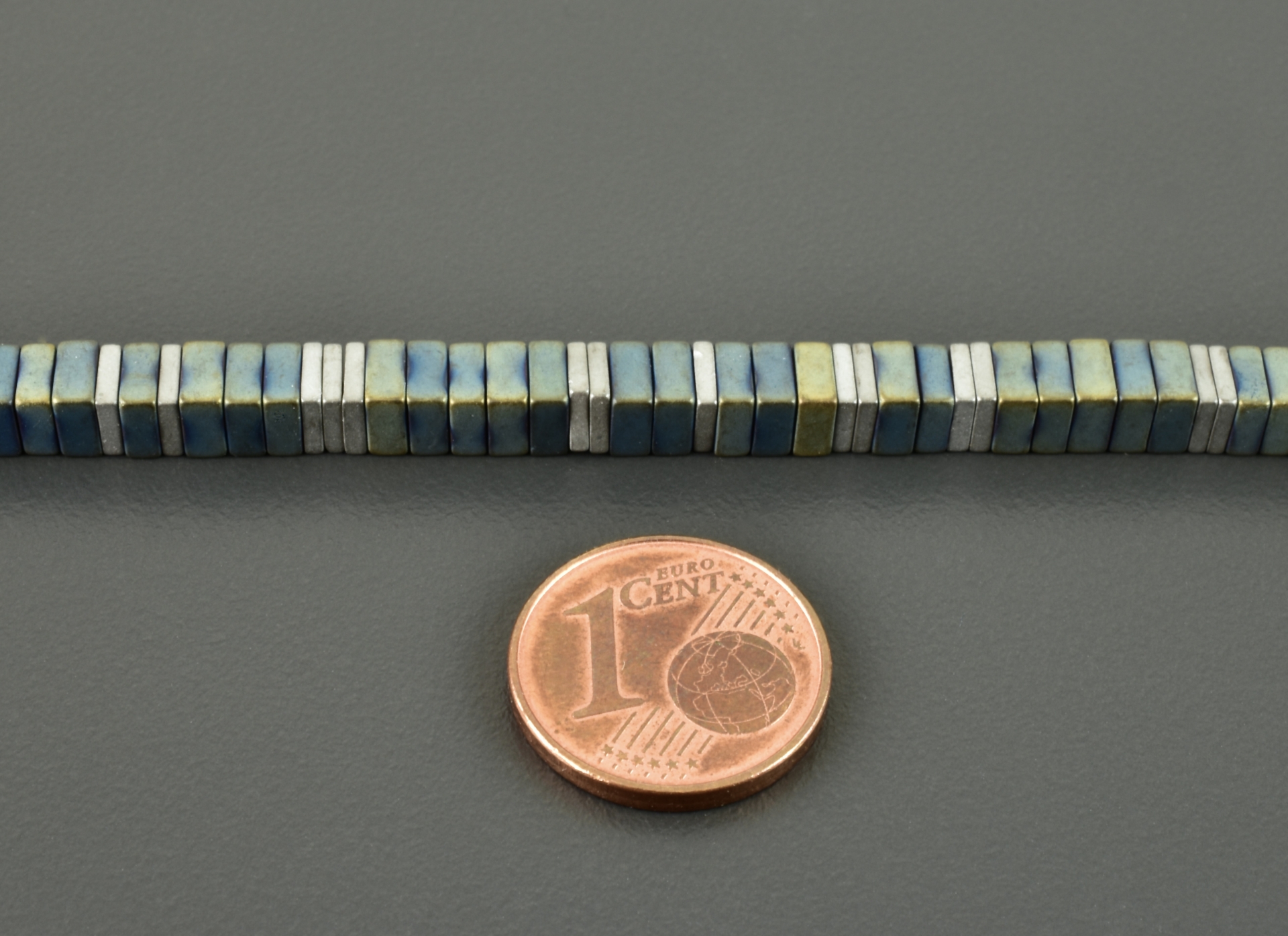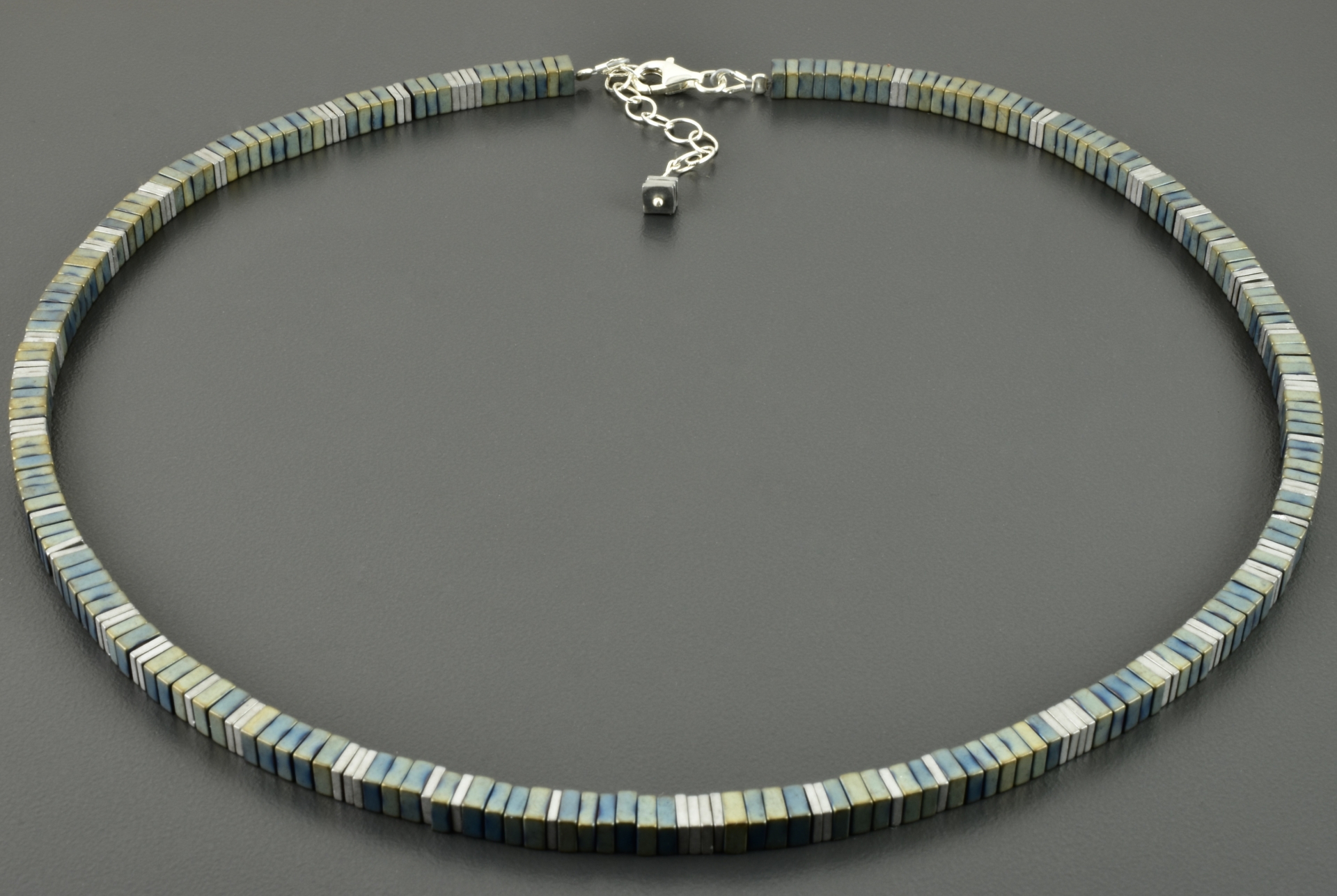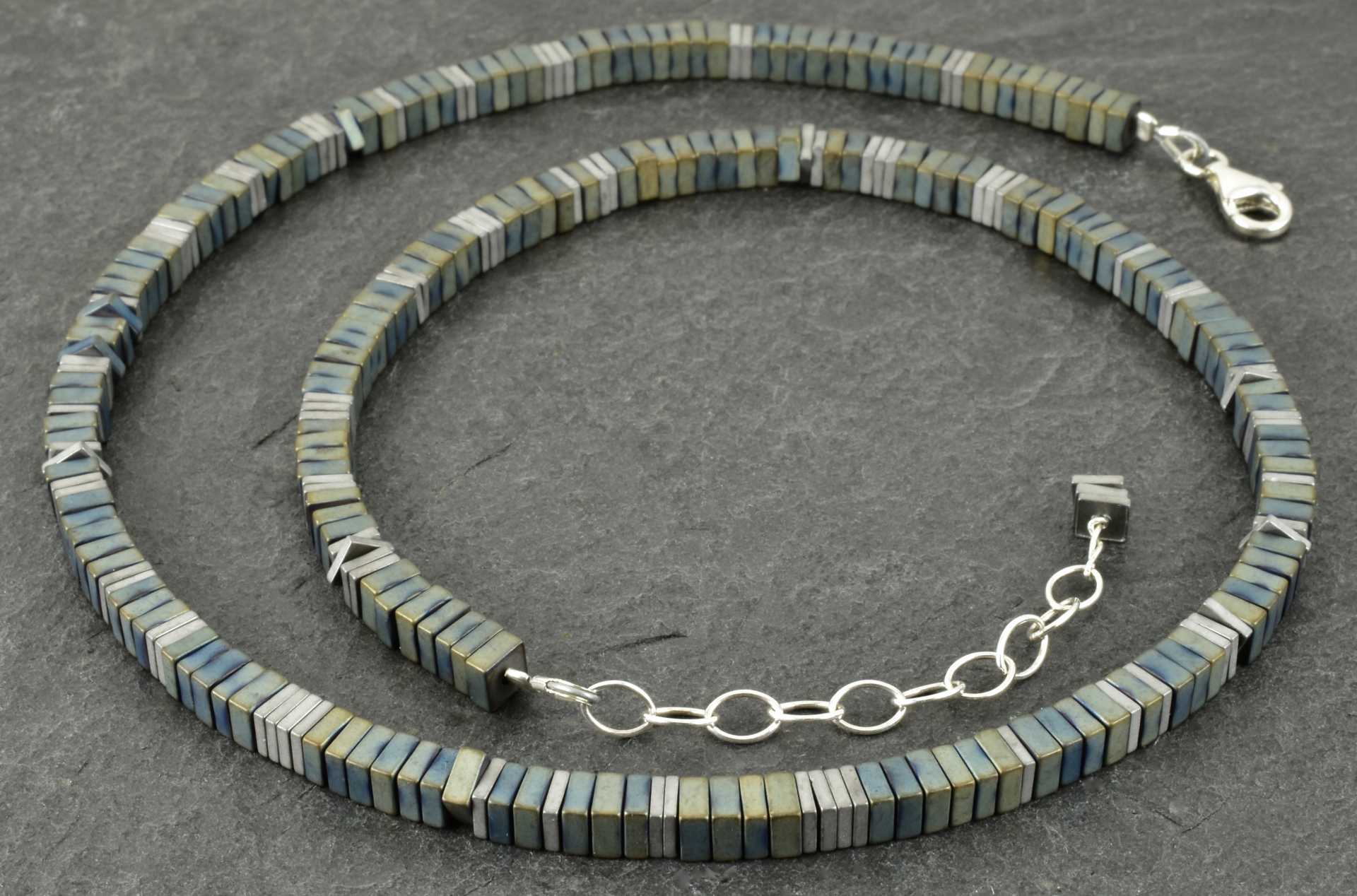 Der Hämatit wurde behandelt, damit er diesen interessanten Farbton bekommt. Der überwiegende Teil der Steine ist blau-grün-grau und 6 mm x 1 mm groß. In unregelmäßigen Abständen habe ich etwas schmalere Steine in einem matten silber eingefügt.