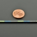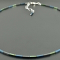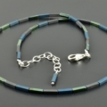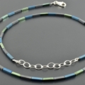 Die matt grauen Hämatitrechtecke wechseln sich ab mit Rechtecken, die durch Galvanisieren, einmal matt-blau und einmal glänzend grün geworden sind. Die Farben sind leicht unterschiedlich und ergeben ein schönes Farbspiel, auch durch den Kontrast der matten und glänzenden Steine.