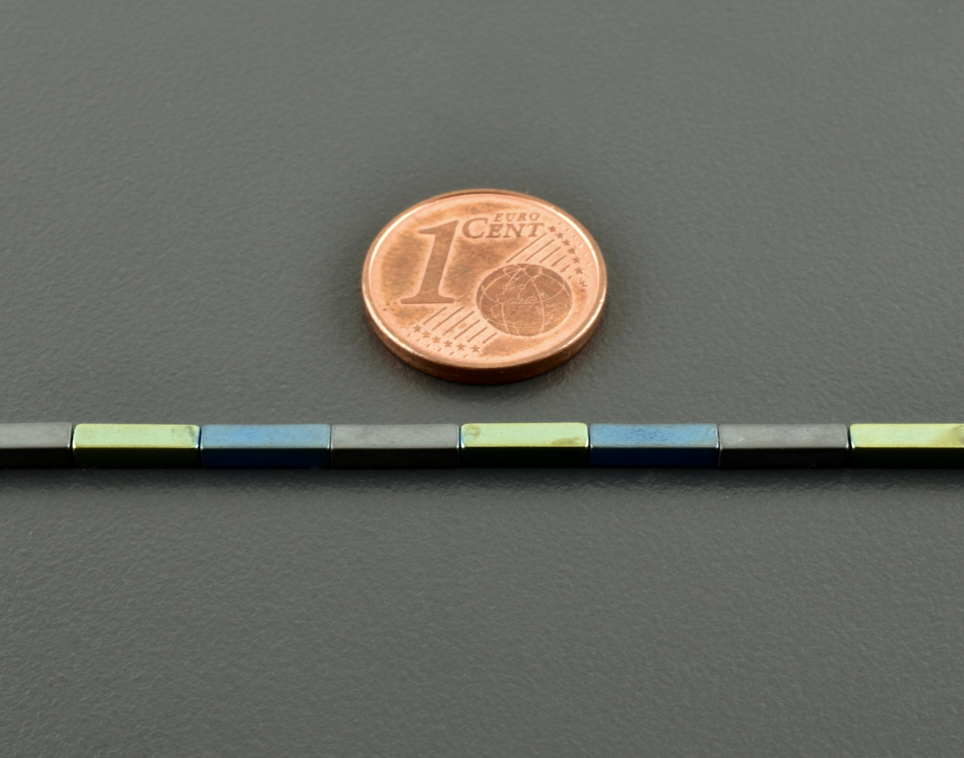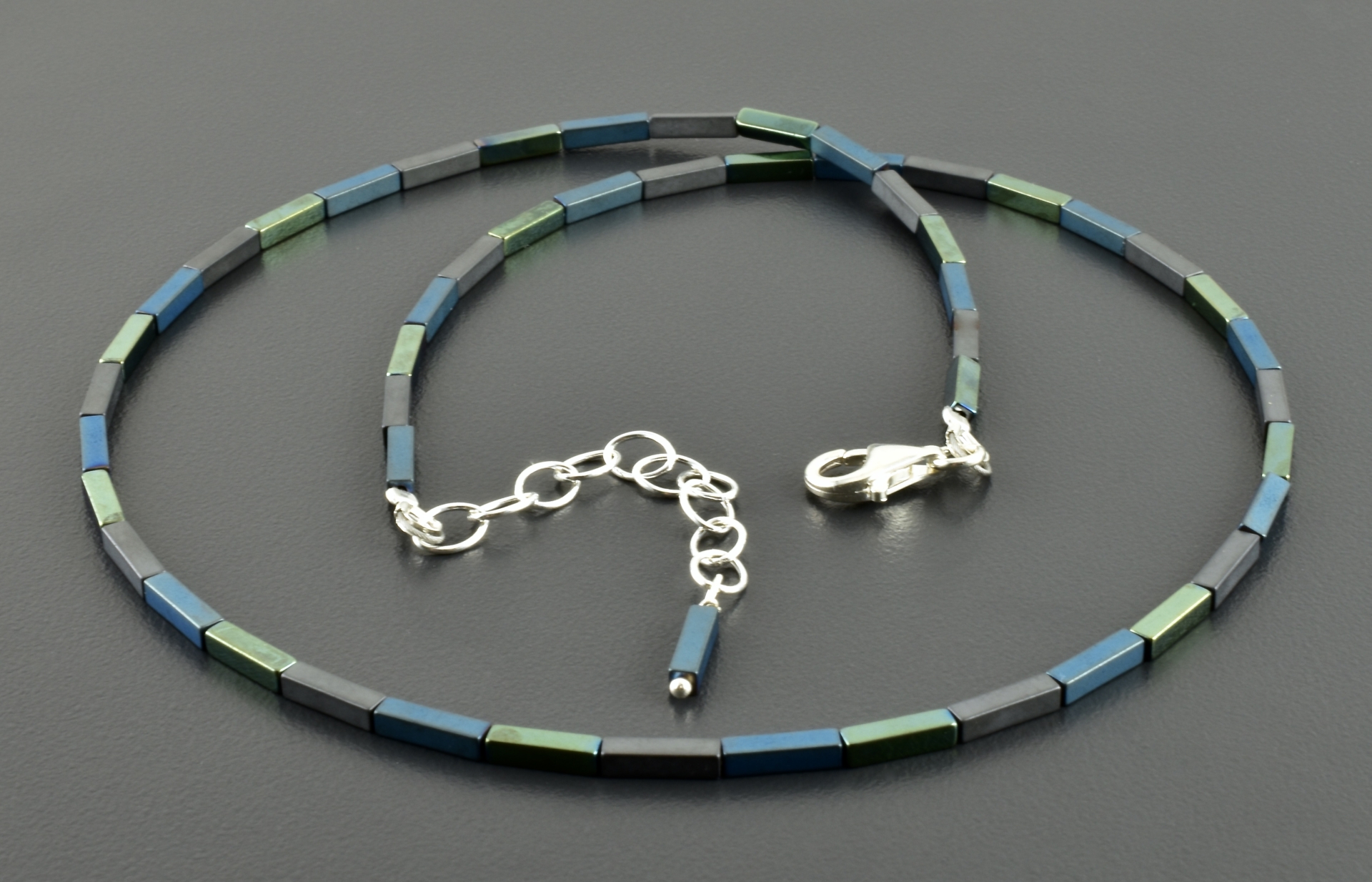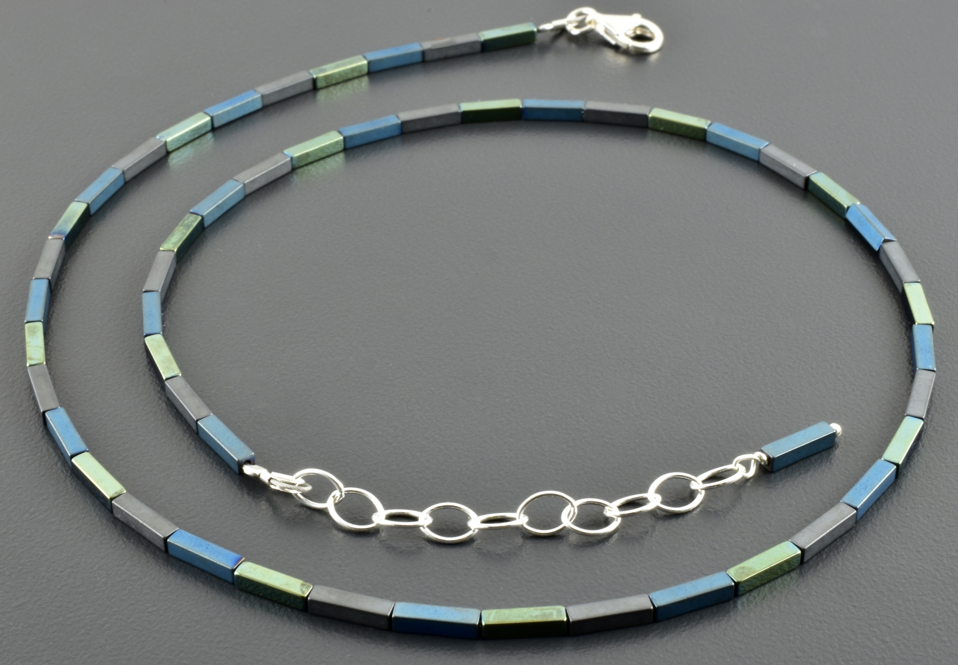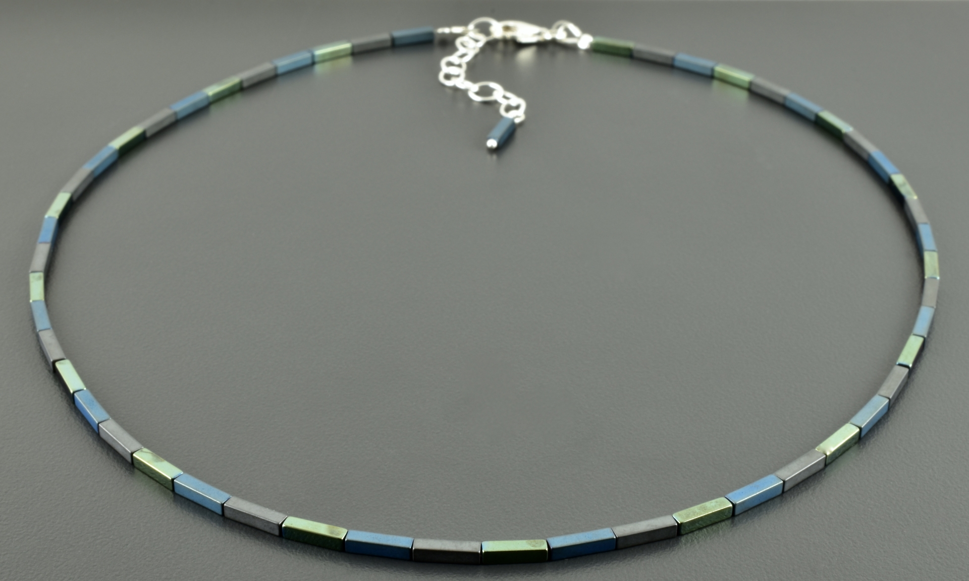 Die matt grauen Hämatitrechtecke wechseln sich ab mit Rechtecken, die durch Galvanisieren, einmal matt-blau und einmal glänzend grün geworden sind. Die Farben sind leicht unterschiedlich und ergeben ein schönes Farbspiel, auch durch den Kontrast der matten und glänzenden Steine.