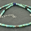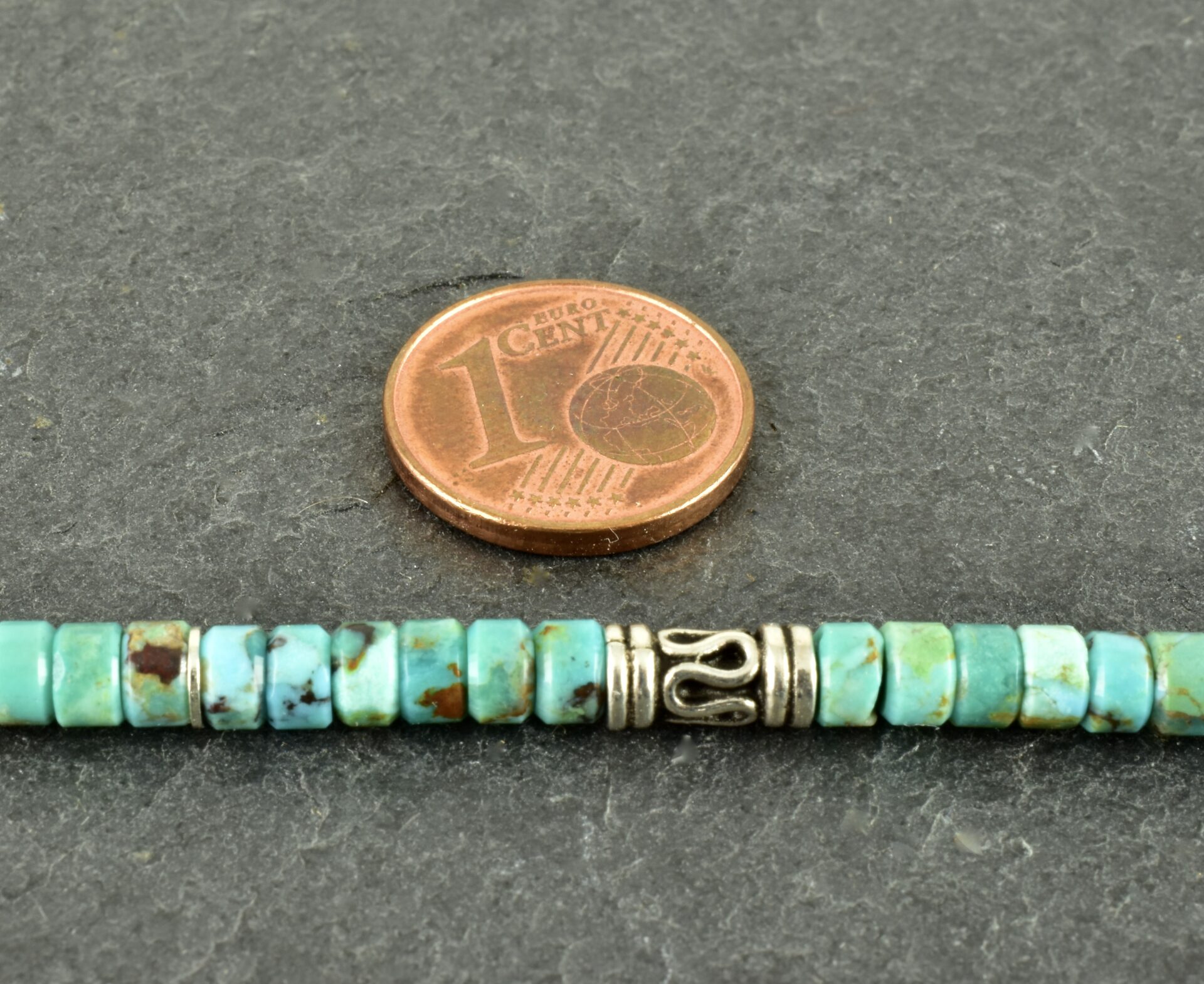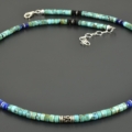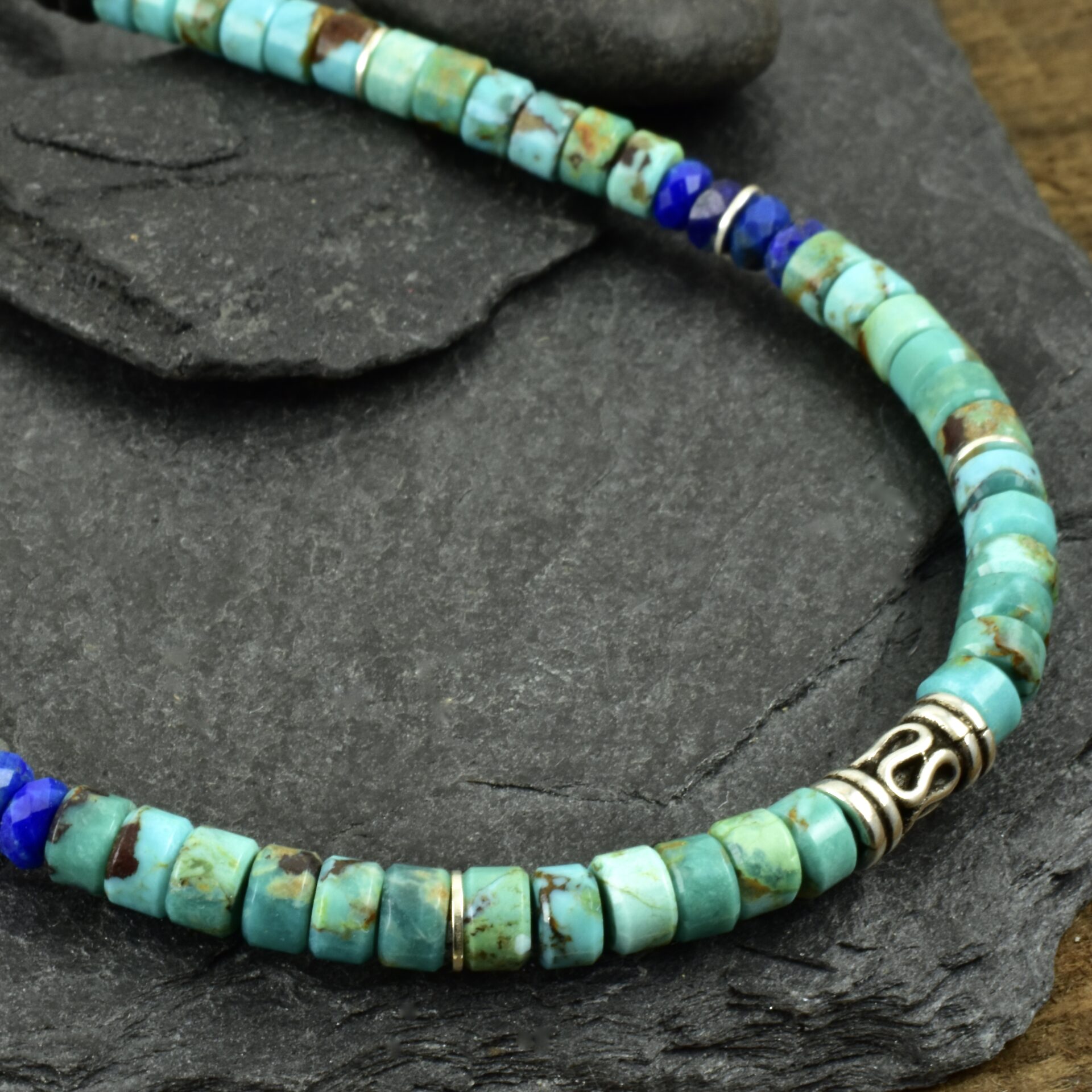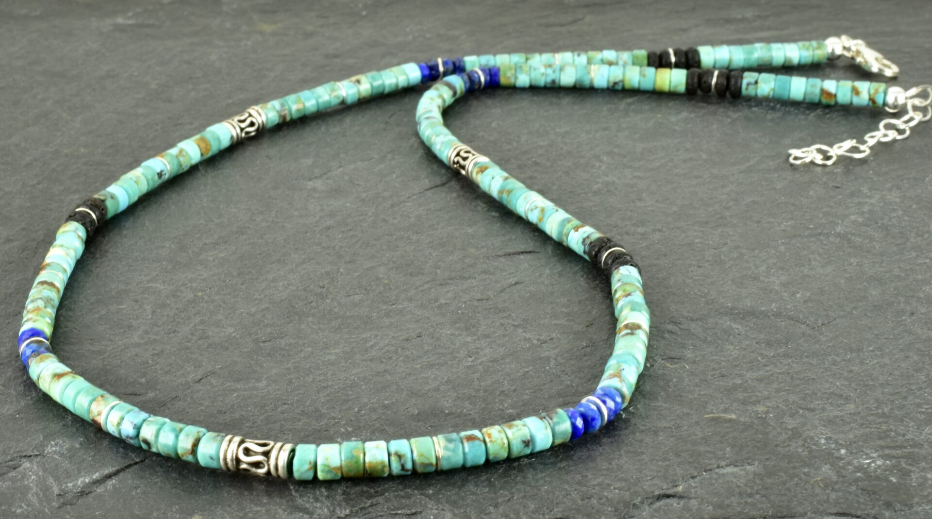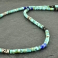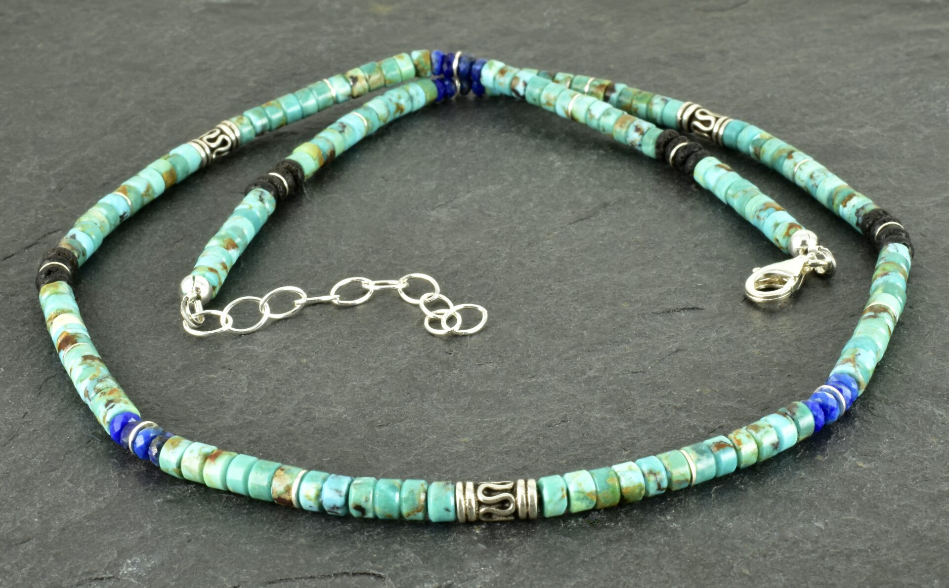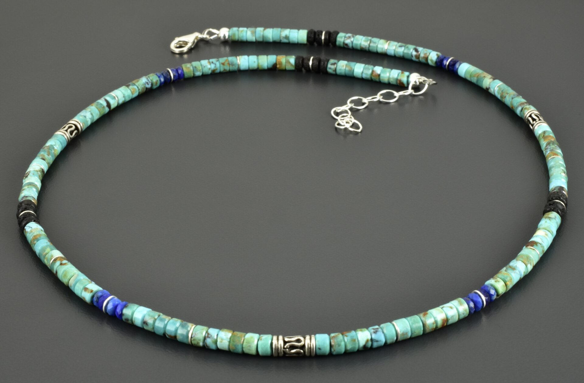 Die schmalen Türkis-Röhrchen sind ca. 2 x 4 mm groß. In regelmäßigen Abständen habe ich schwarze Lavascheiben und Scheiben aus dunkelblauem Lapislazuli eingefügt. Die verzierten Röhrchen und Scheiben aus 925er Silber machen das Design komplett.