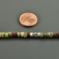 Die schmalen Röhrchen sind ca. 2 x 4 mm groß. Der Jaspis ist grün und rötlichbraun, viele Steine sind zweifarbig. Keine Perle sieht aus wie die andere. Ein einzigartiges Schmuckstück.