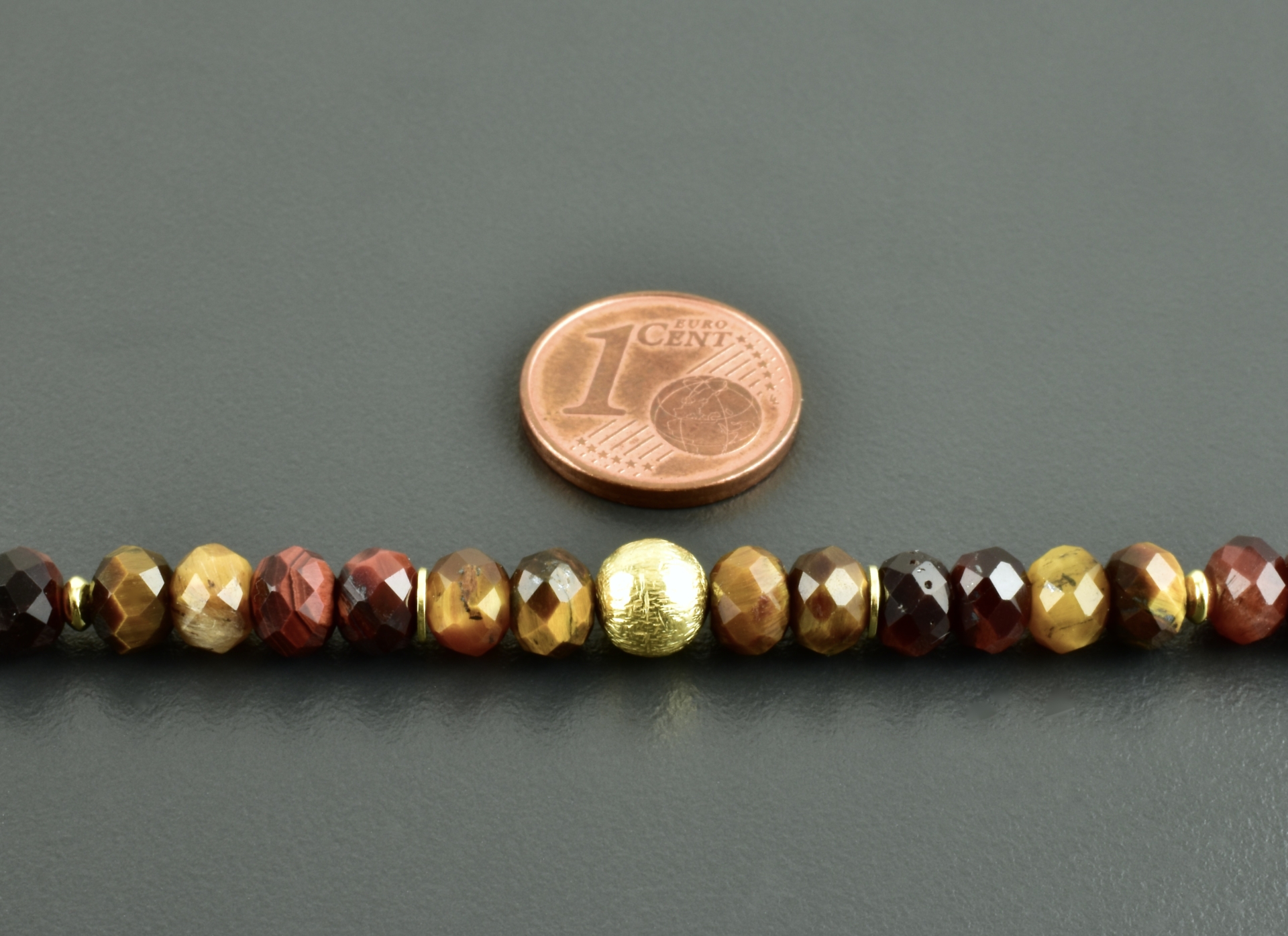 Die Steine sind 6 mm groß und um die 4 mm breit. Die vergoldeten (925er Silber) Scheiben und Linsen sind regelmäßig über die Kette verteilt. Mittig ist eine matt vergoldete Kugel.