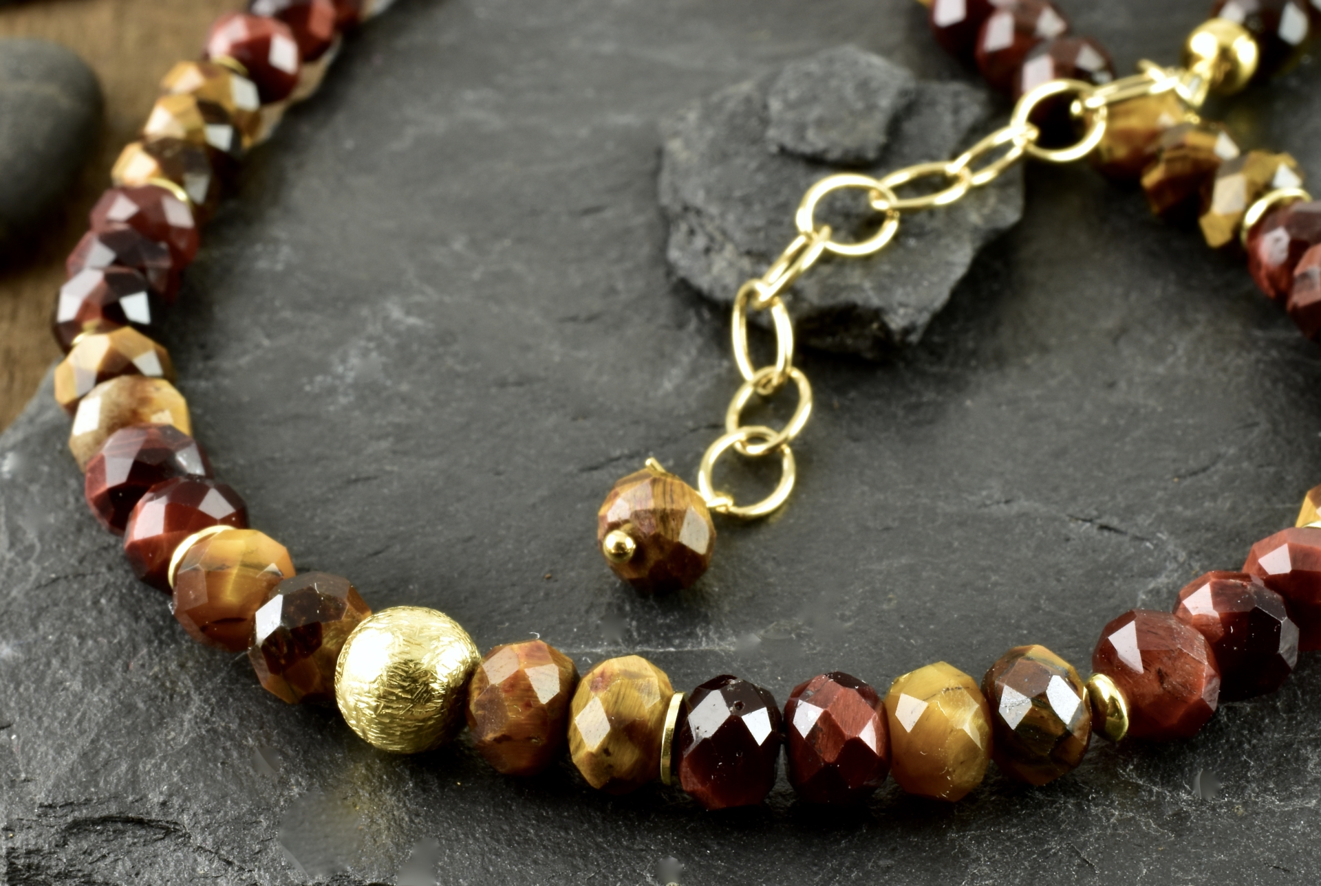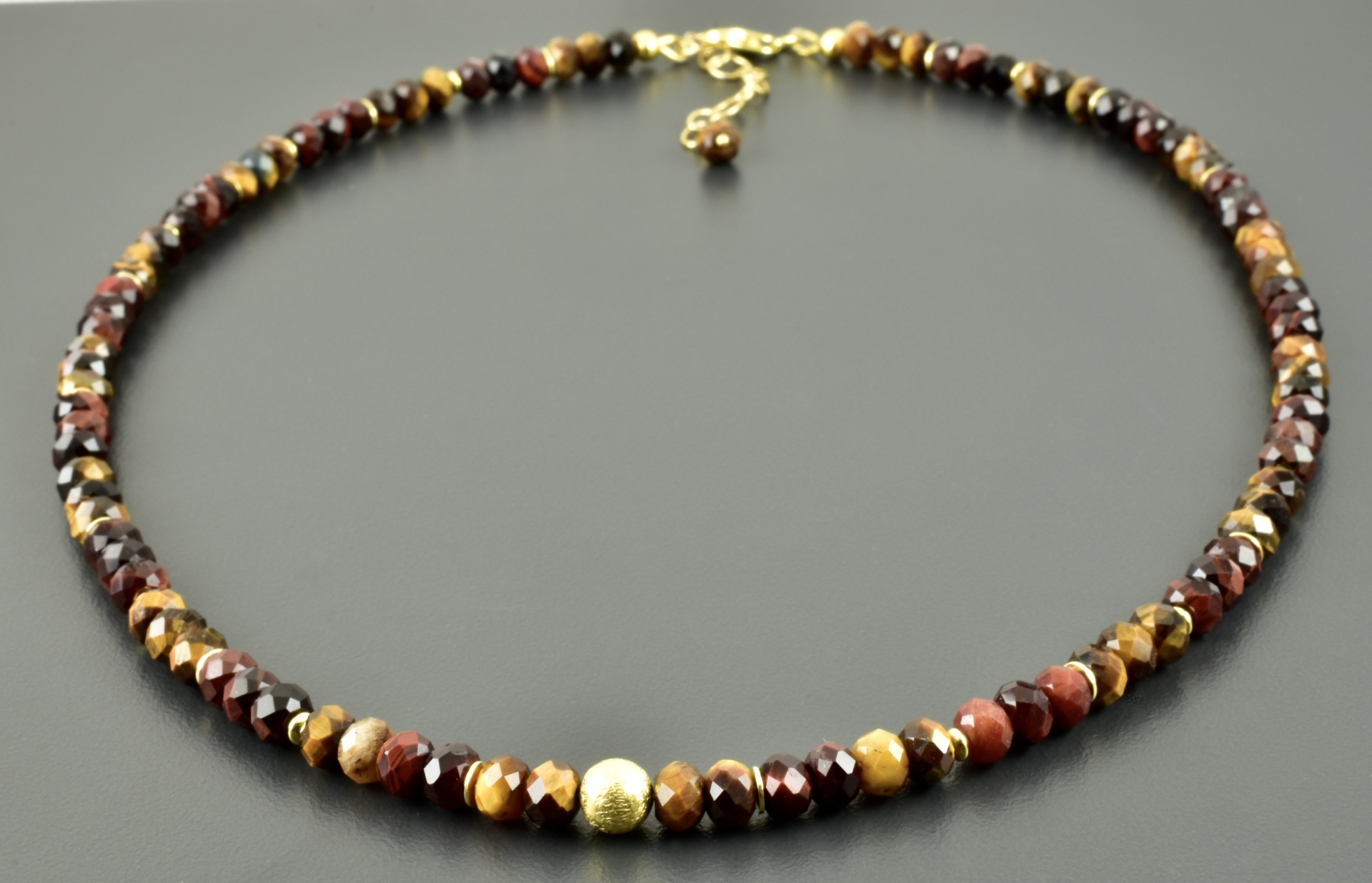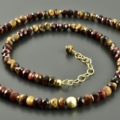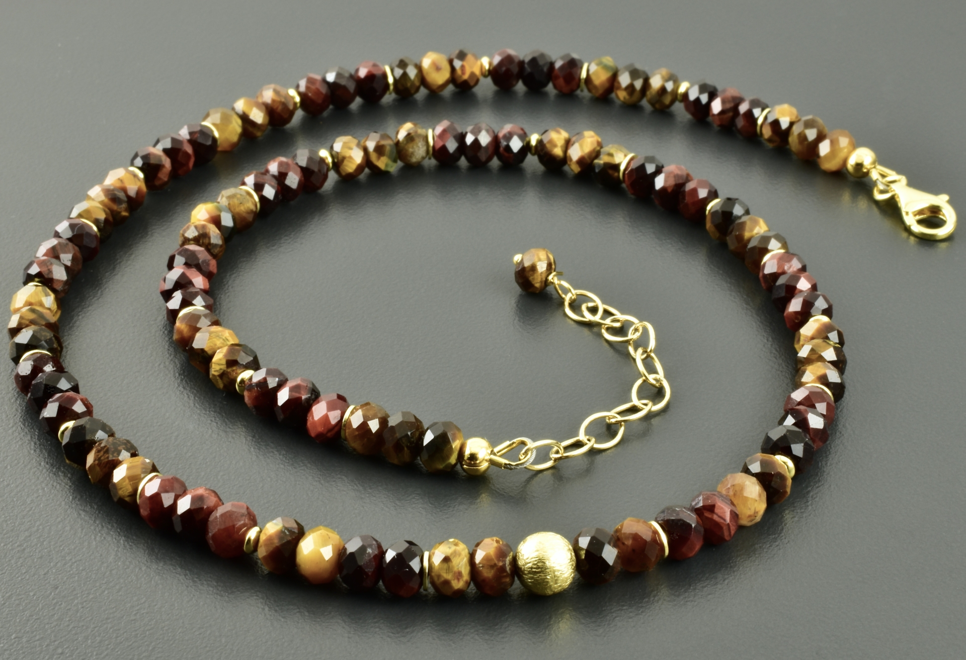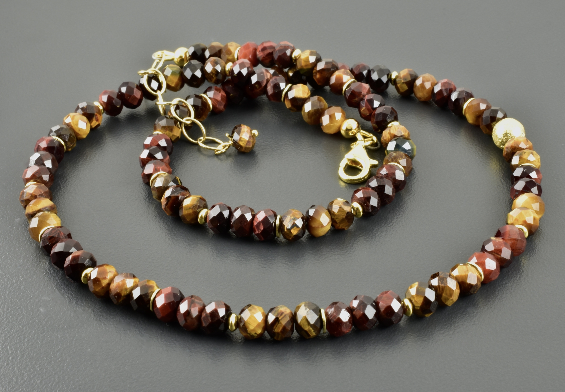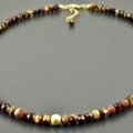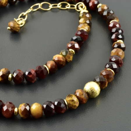Halskette mit Steinen aus Tigerauge und Falkenauge. Die Perlen sind facettierte Button und haben wunderschöne Farben.