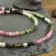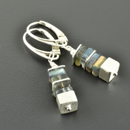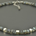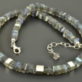 Für diese Halskette habe ich viereckige Labradoritscheiben in 6 mm ausgesucht. Im vorderen Bereich wurde mittig ein 6 mm, matter Silberwürfel gesetzt und rechts und links davon ein „halber“ Würfel und schmale Scheiben aus 925er Silber. Die Elemente sind symmetrisch angeordnet.