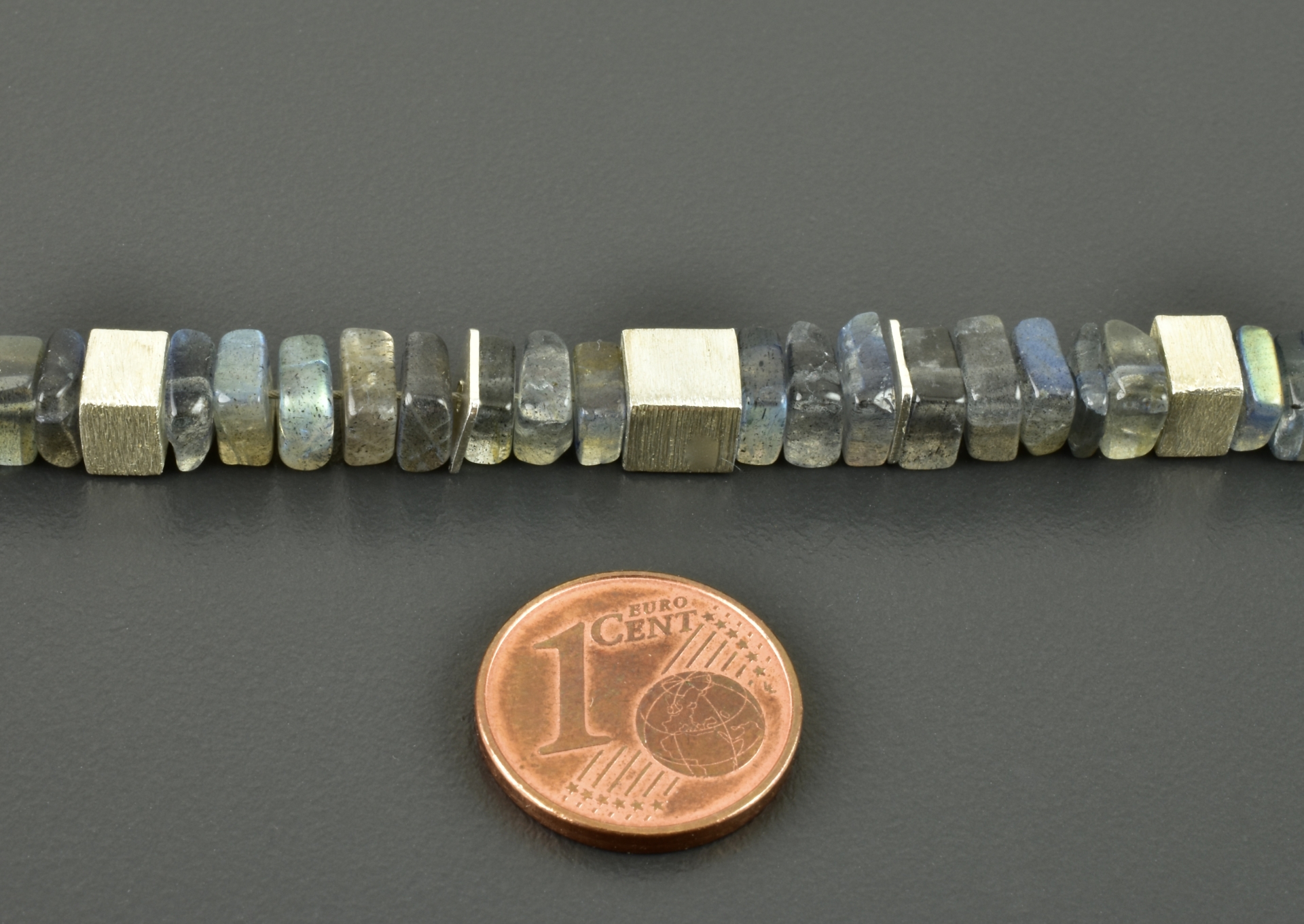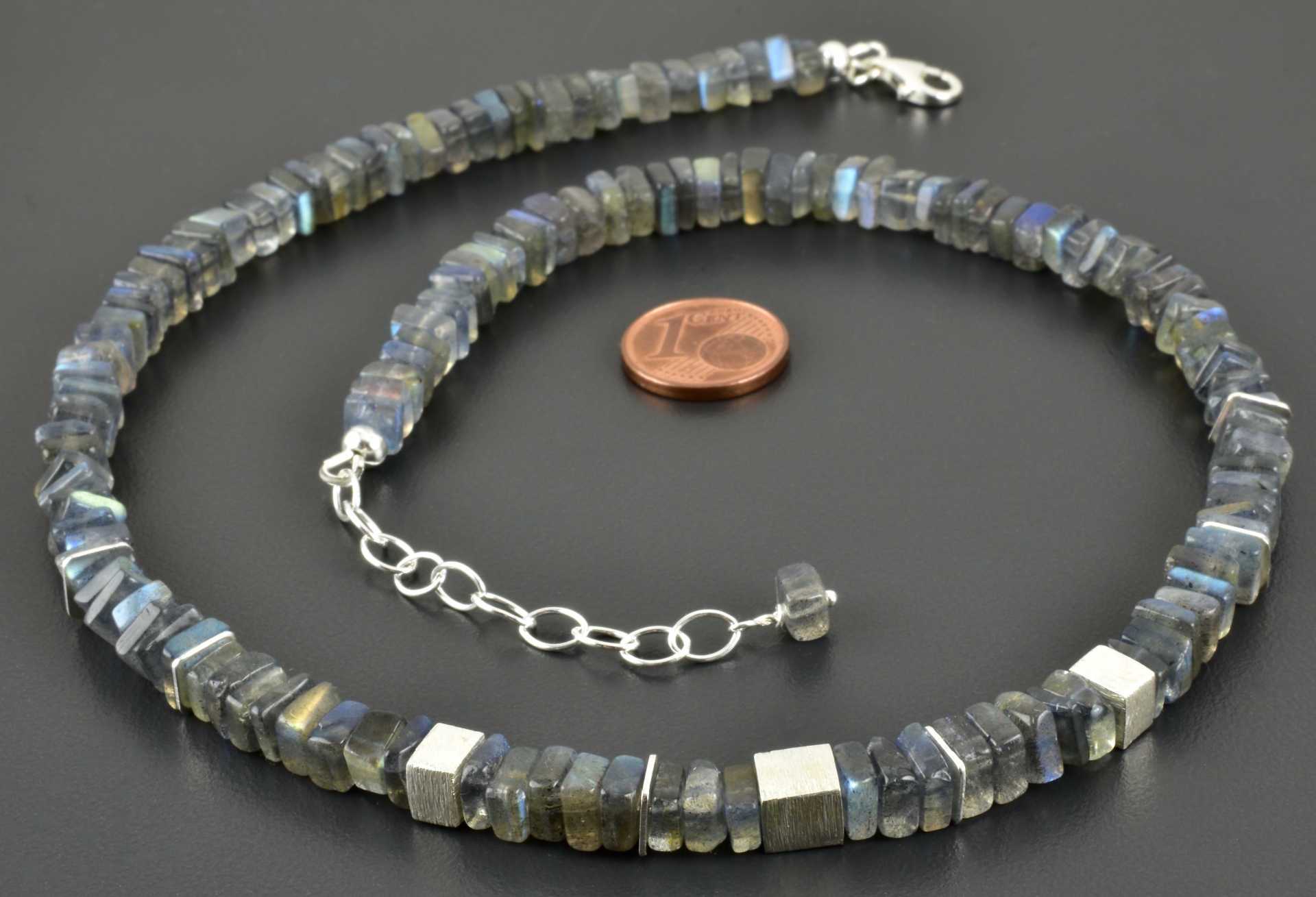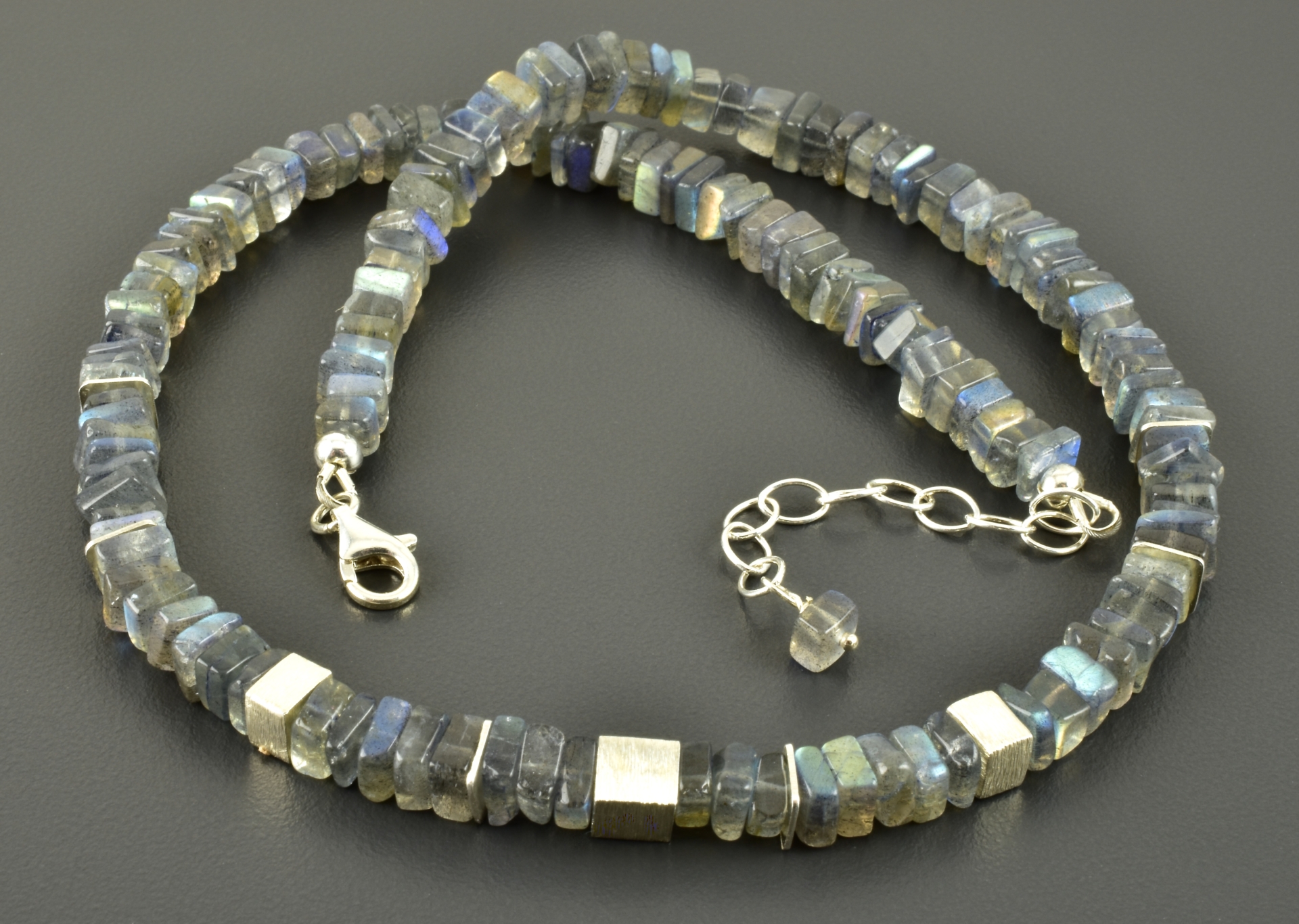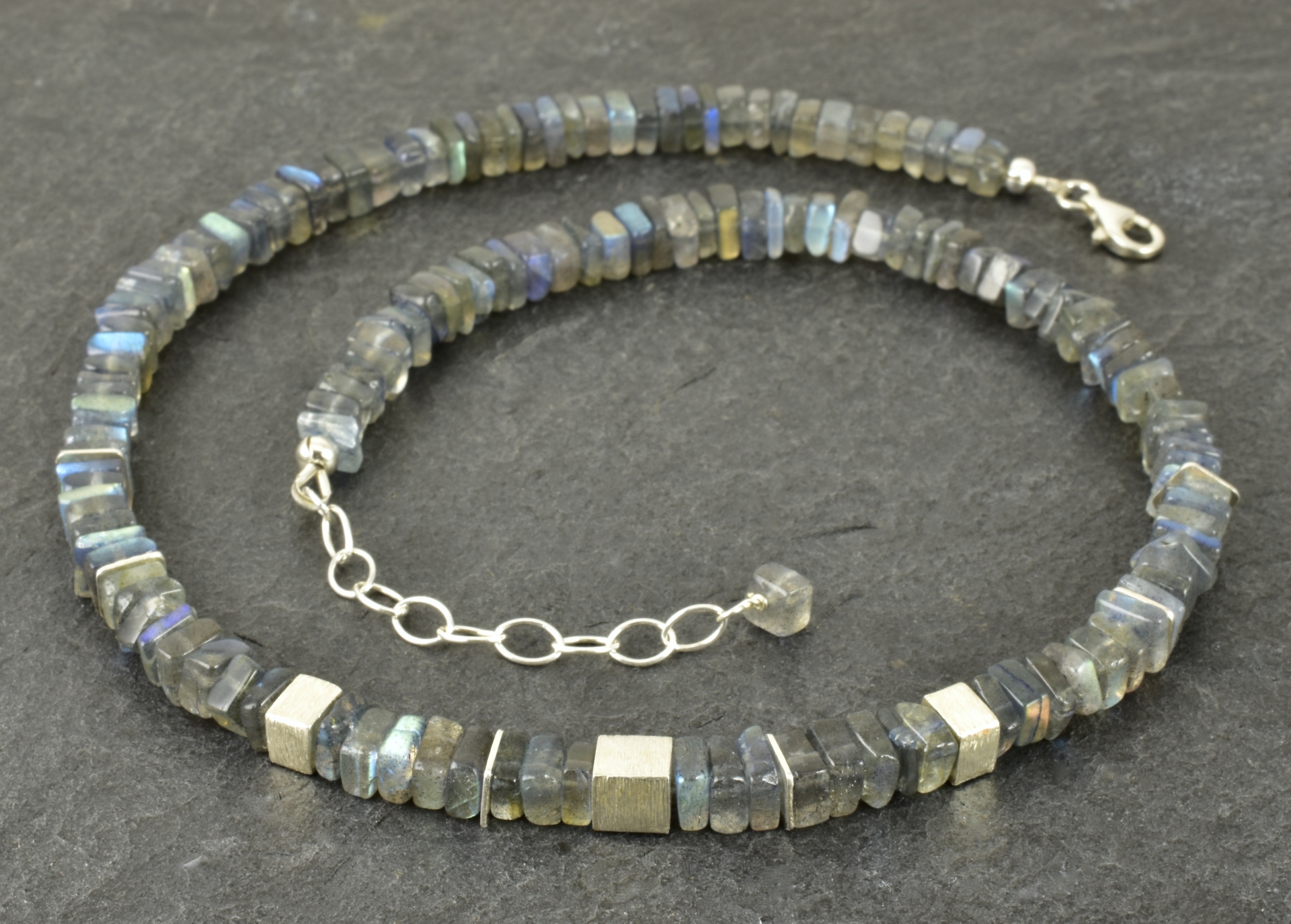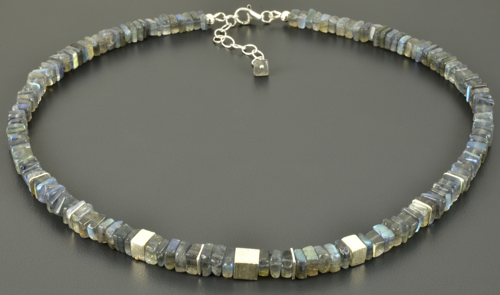 Für diese Halskette habe ich viereckige Labradoritscheiben in 6 mm ausgesucht. Im vorderen Bereich wurde mittig ein 6 mm, matter Silberwürfel gesetzt und rechts und links davon ein „halber“ Würfel und schmale Scheiben aus 925er Silber. Die Elemente sind symmetrisch angeordnet.