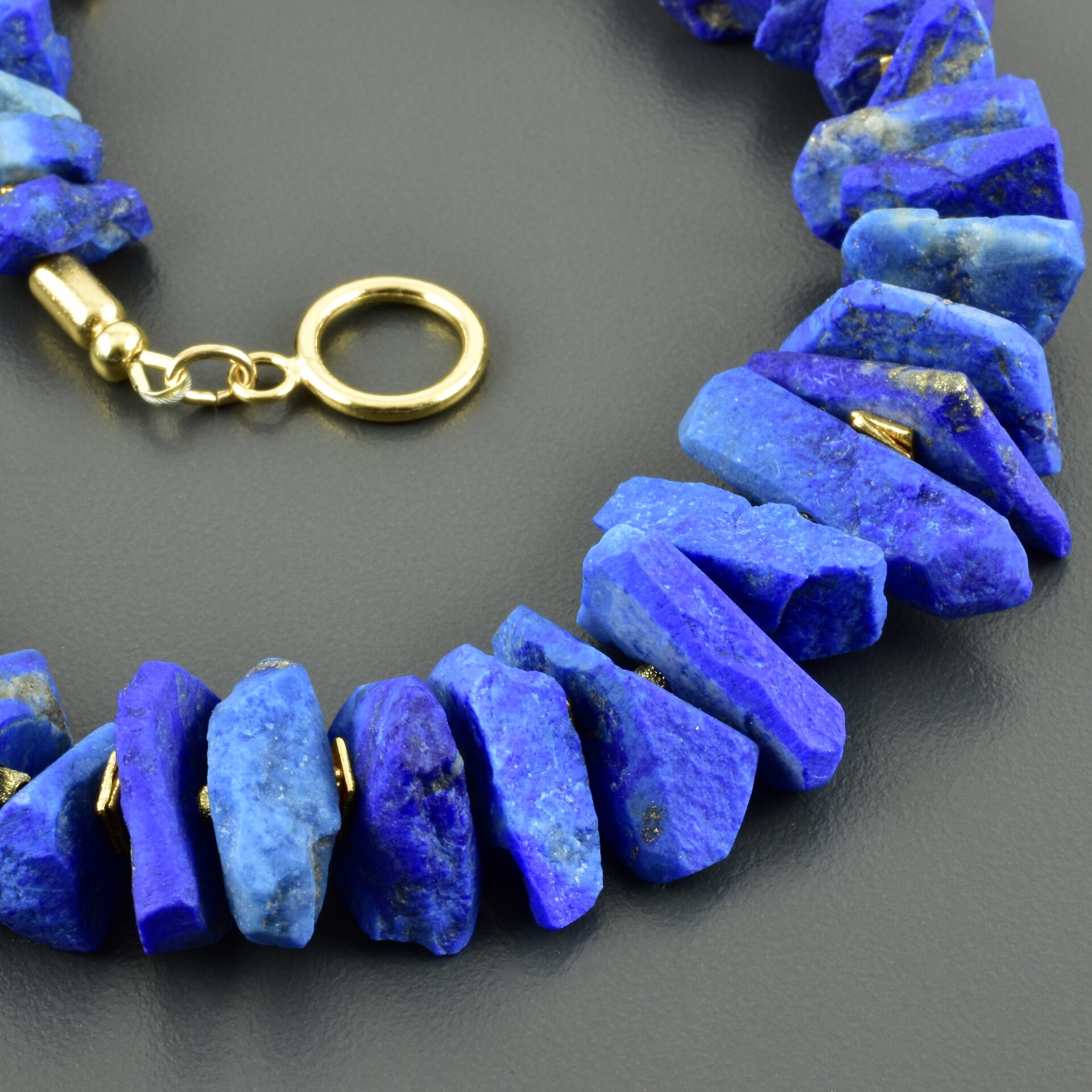 Der Lapis ist matt und von wunderschöner blauer Farbe, mit helltürkisen Stellen. Schön zu sehen sind auch die für den Lapis typischen Pyriteinschlüsse. Die Steine sind im vorderen Bereich ca. 10 x 25 mm groß und verjüngen sich bis zu ca. 5 x 18 mm zum Verschluss der Kette. Ein besonderes Unikat, kein Stein sieht aus wie der andere!
