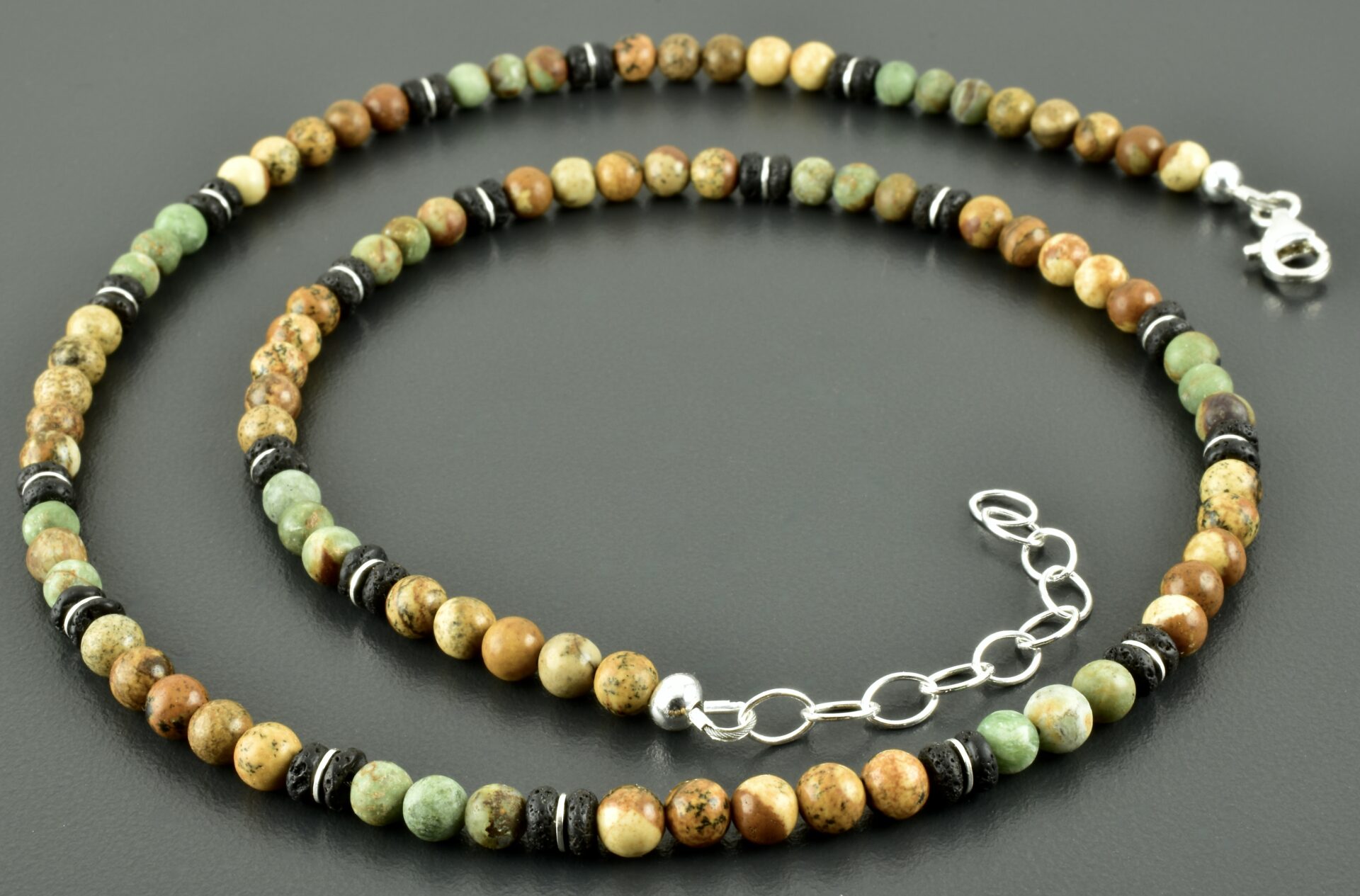 Für diese Halskette habe ich Landschaftsjaspis, grünen Opal und Lava ausgesucht. Die Steine sind symmetrisch angeordnet. Die Kugeln haben eine Größe von 4 mm, ebenso die Scheiben aus Lava. Zwischen die Lavascheiben wurden schmale Scheiben aus 925er Silber gesetzt, die einen schönen Kontrast bilden.