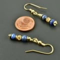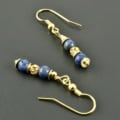 Zauberhafte Hängeohrringe aus Dumortieritkugeln und vergoldetem 925er Silber. Die Kugeln sind 4 mm groß und haben einen schönen Blauton, der schwarze Einsprengsel hat. Die Faben der Edelsteine werden durch die vergoldeten Silberelemente noch hervorgehoben. Mittig ist eine luftig-leichte Webkugel, zusätzlich wurden flache Scheiben eingefügt.