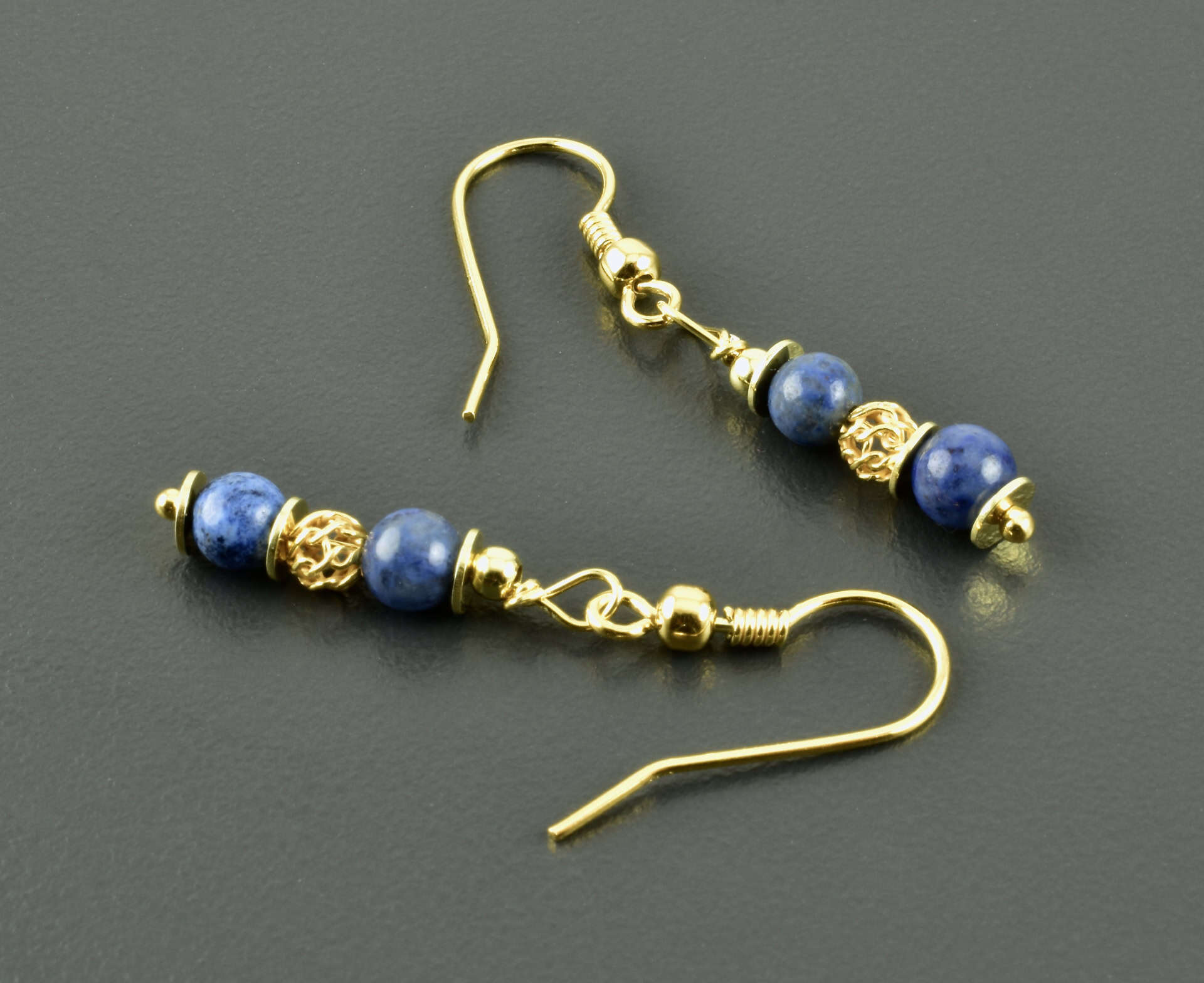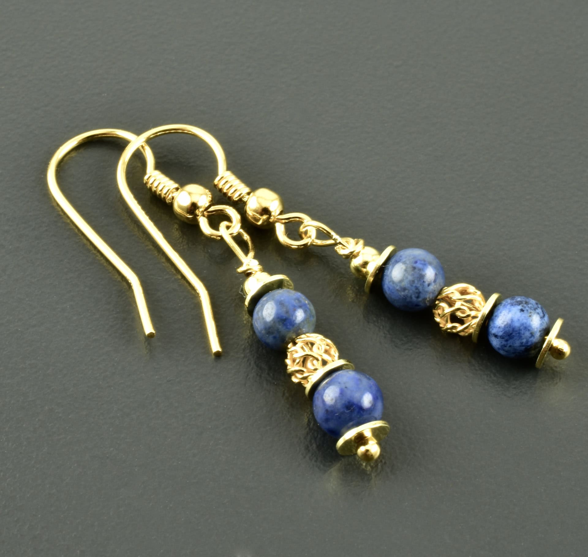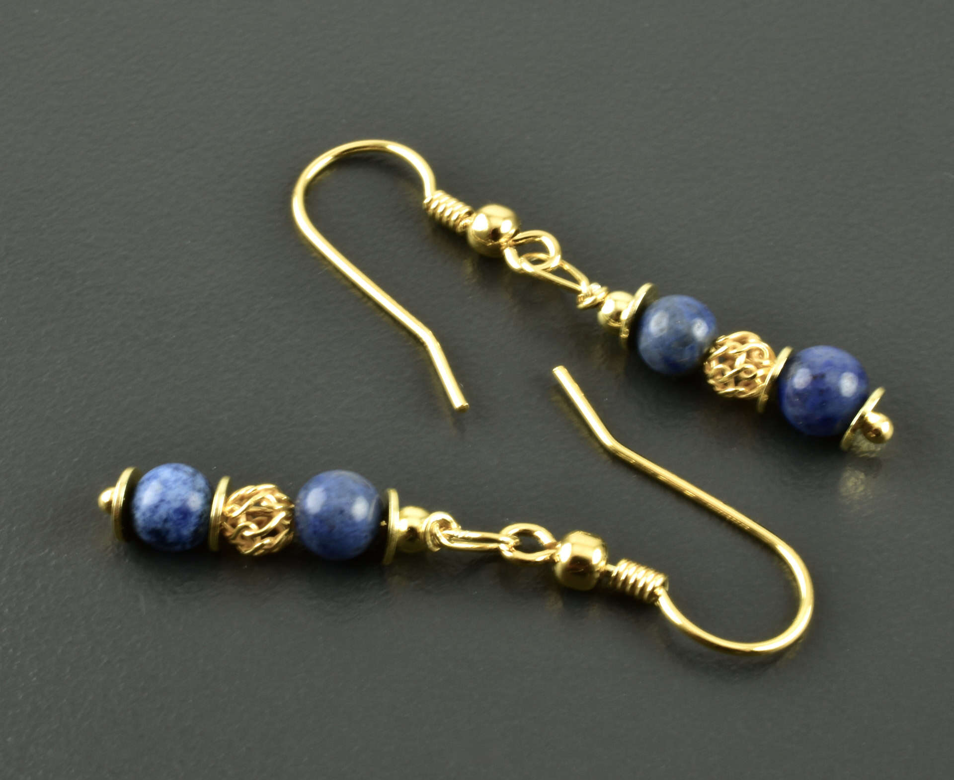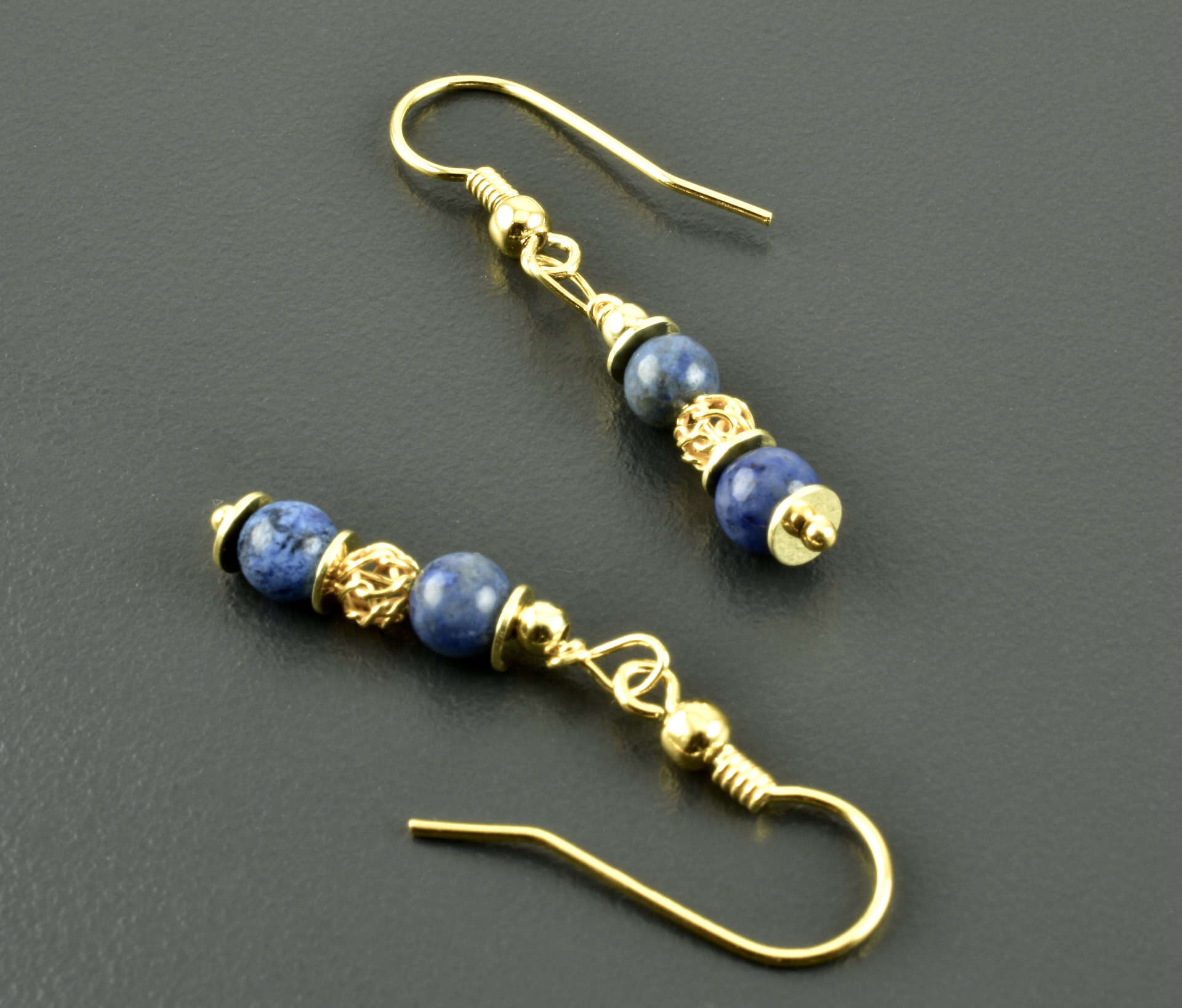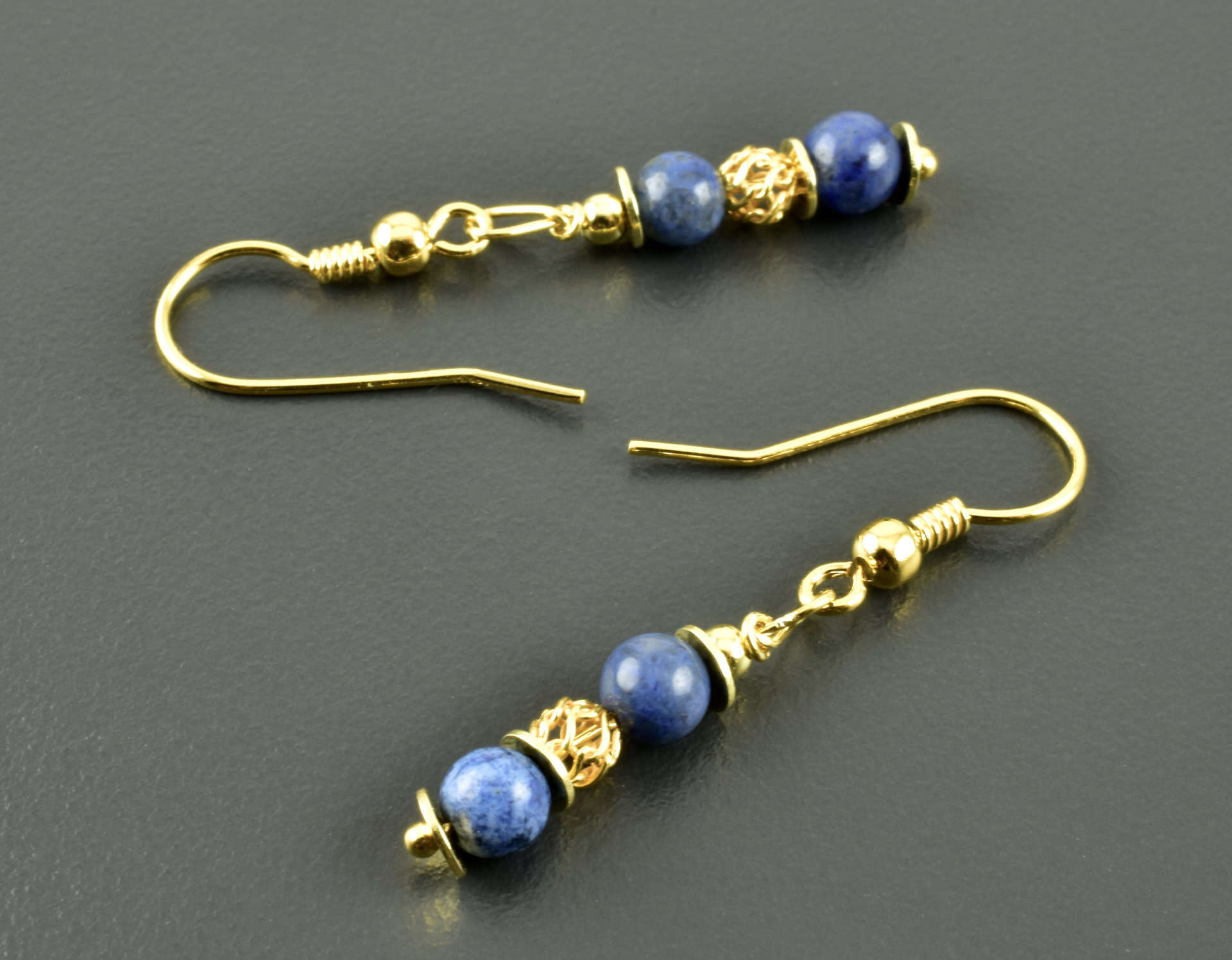 Zauberhafte Hängeohrringe aus Dumortieritkugeln und vergoldetem 925er Silber. Die Kugeln sind 4 mm groß und haben einen schönen Blauton, der schwarze Einsprengsel hat. Die Faben der Edelsteine werden durch die vergoldeten Silberelemente noch hervorgehoben. Mittig ist eine luftig-leichte Webkugel, zusätzlich wurden flache Scheiben eingefügt.