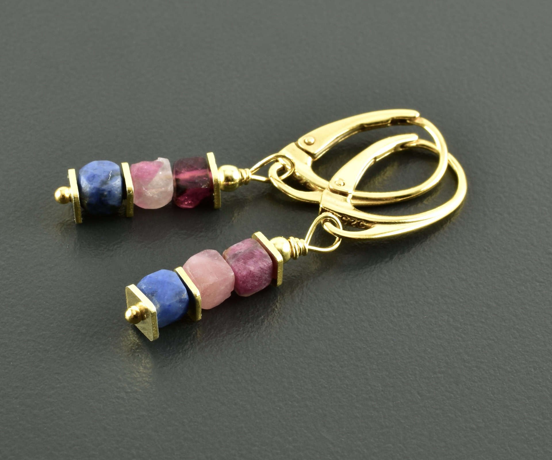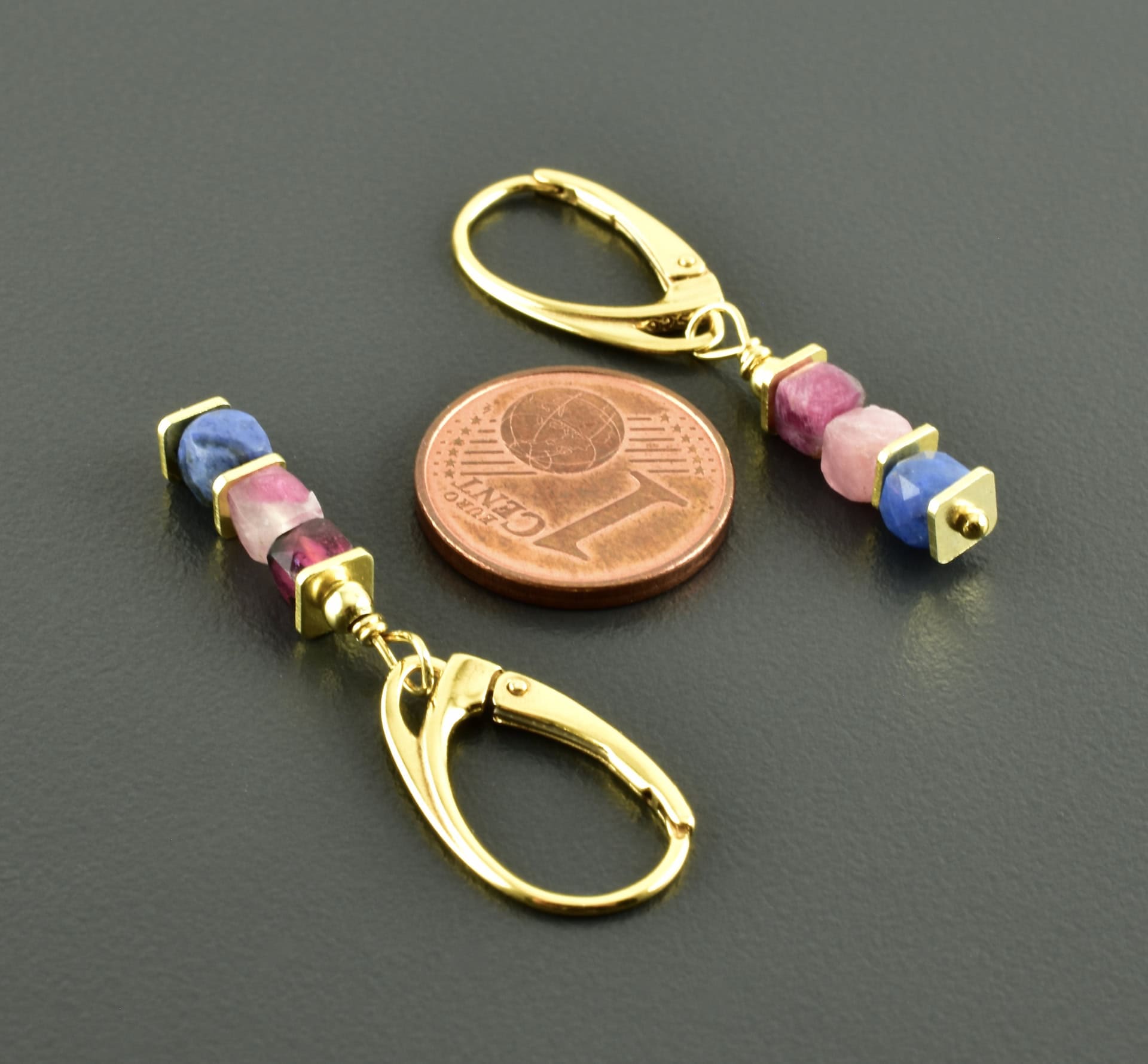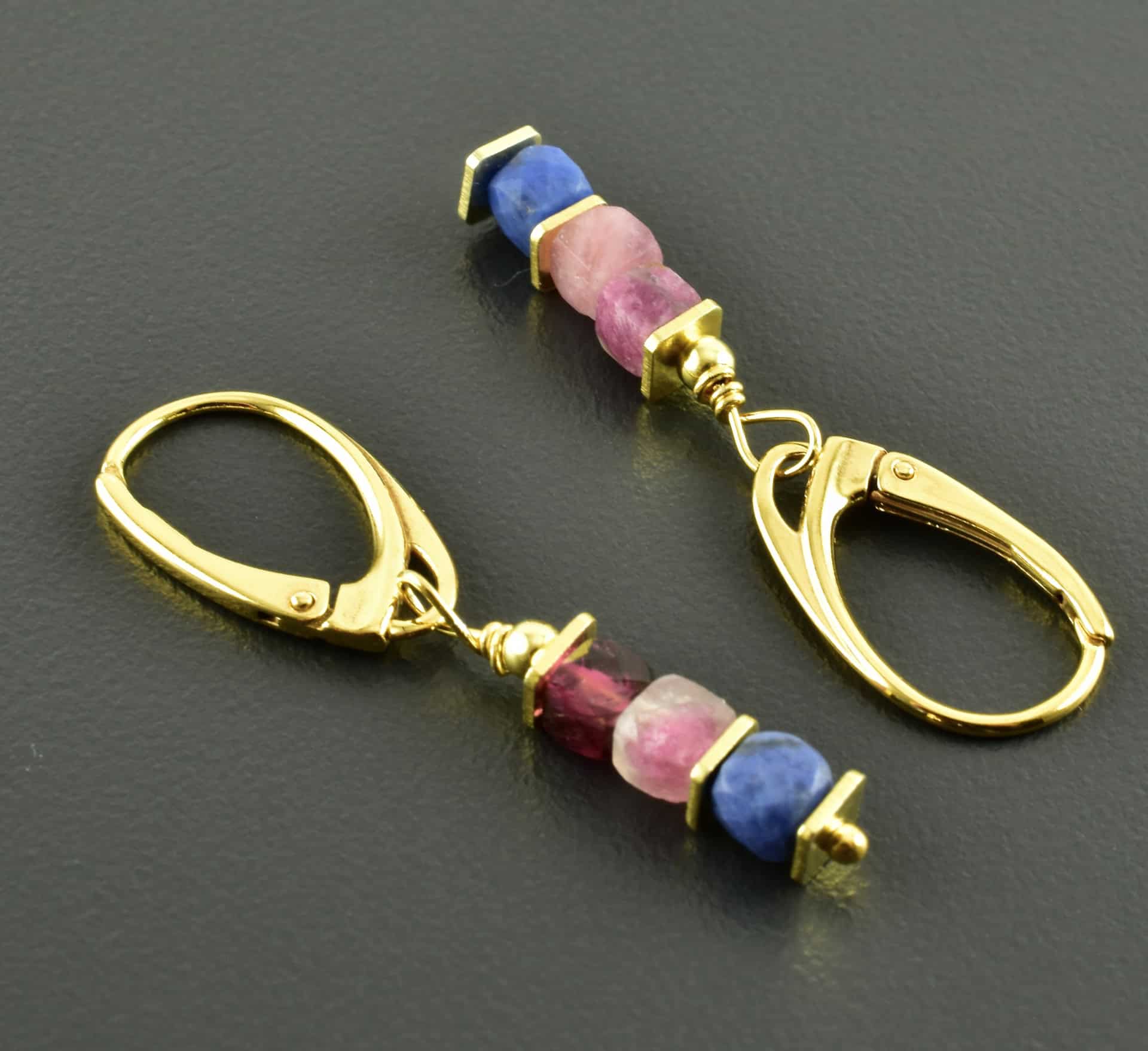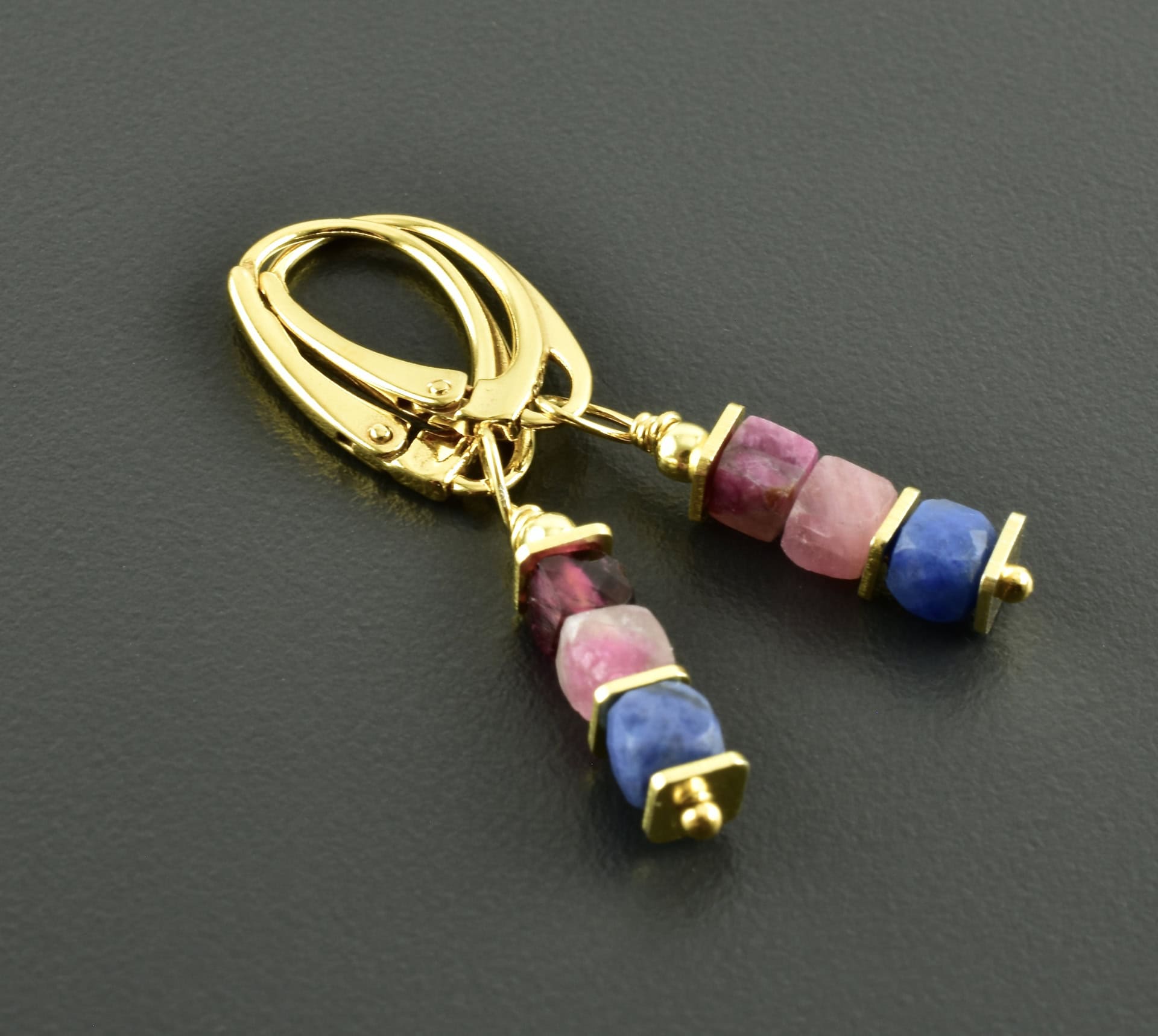 Für dieses Ohrringe habe ich 3,5 mm große, bunte Turmalinwürfel mit dunkelblauen Würfeln aus Dumortierit ausgesucht und mit viereckigen vergoldeten Scheiben aus 925er Silber kombiniert.