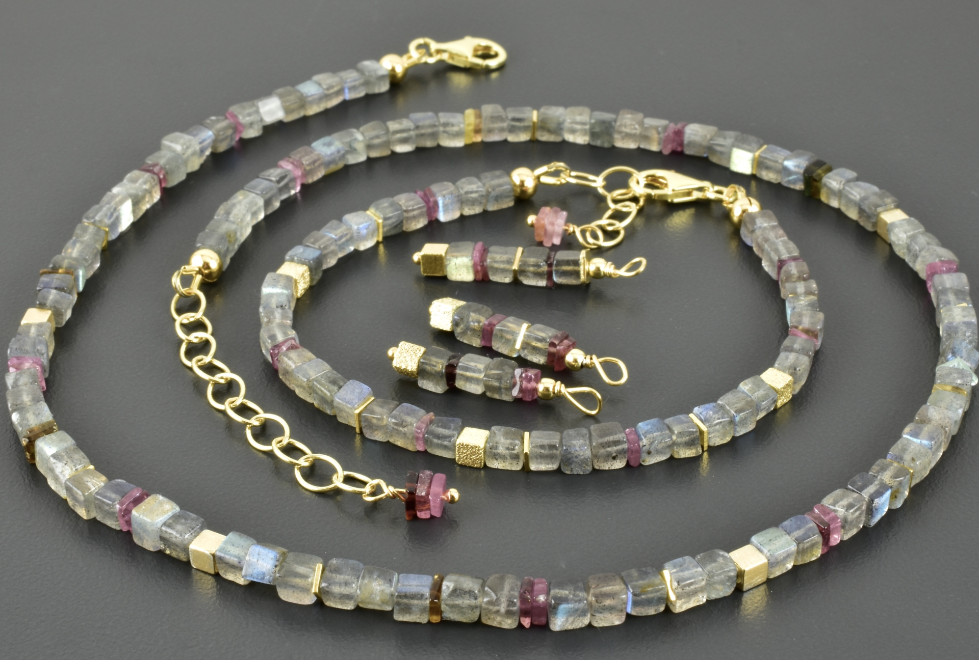 Anfertigung Labradoritwürfelkette mit Turmalin und vergoldetem 925er Silber, dazu ein passendes Armband und 3 Einhänger.