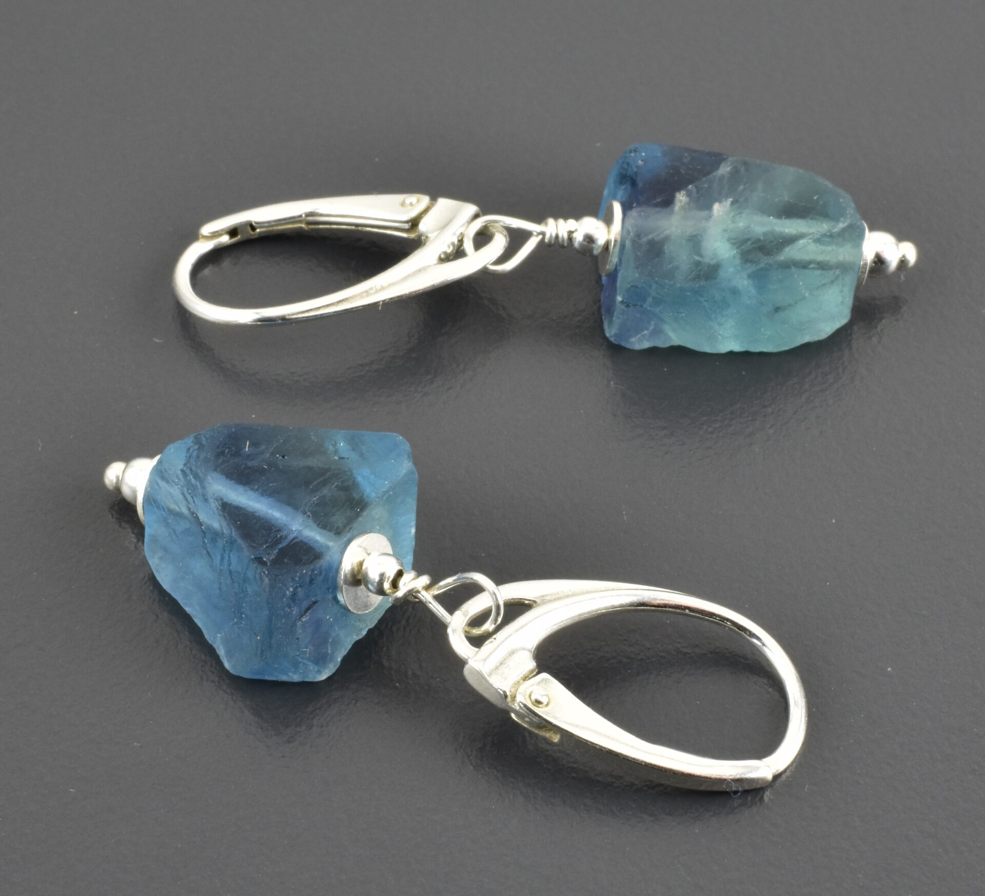 Für diese Ohrhänger habe ich rohe Nuggets aus Fluorit mit 925er Silber kombiniert. Die Steine haben eine tolle blaue Farbe, sie sind etwas unterschiedlich in ihrer Form.