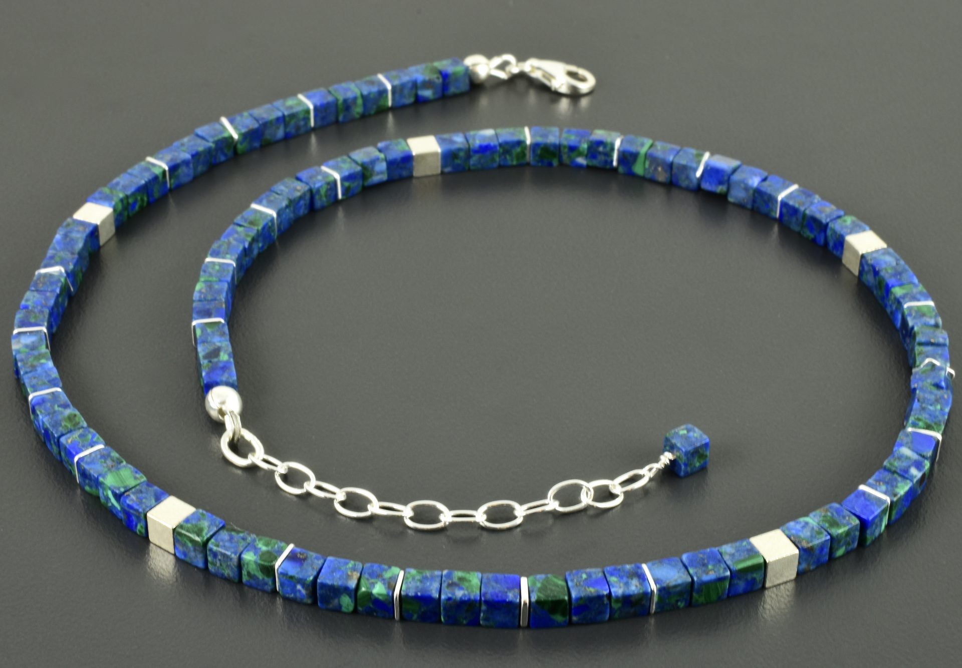 Tolle Würfelkette aus Azurit-Malachit mit edlen, matten Würfeln aus 925er Silber. Scheiben aus Silber habe ich zusätzlich zwischen einzelne Würfel gesetzt.
