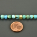 Die facettierten Türkiswürfel sind 4 mm groß. Ich habe sie mit viereckigen vergoldeten Scheiben kombiniert. Sie wurden regelmäßig über die Halskette verteilt. Zusätzlich sind drei der edlen vergoldeten Würfel im vorderen Bereich.
