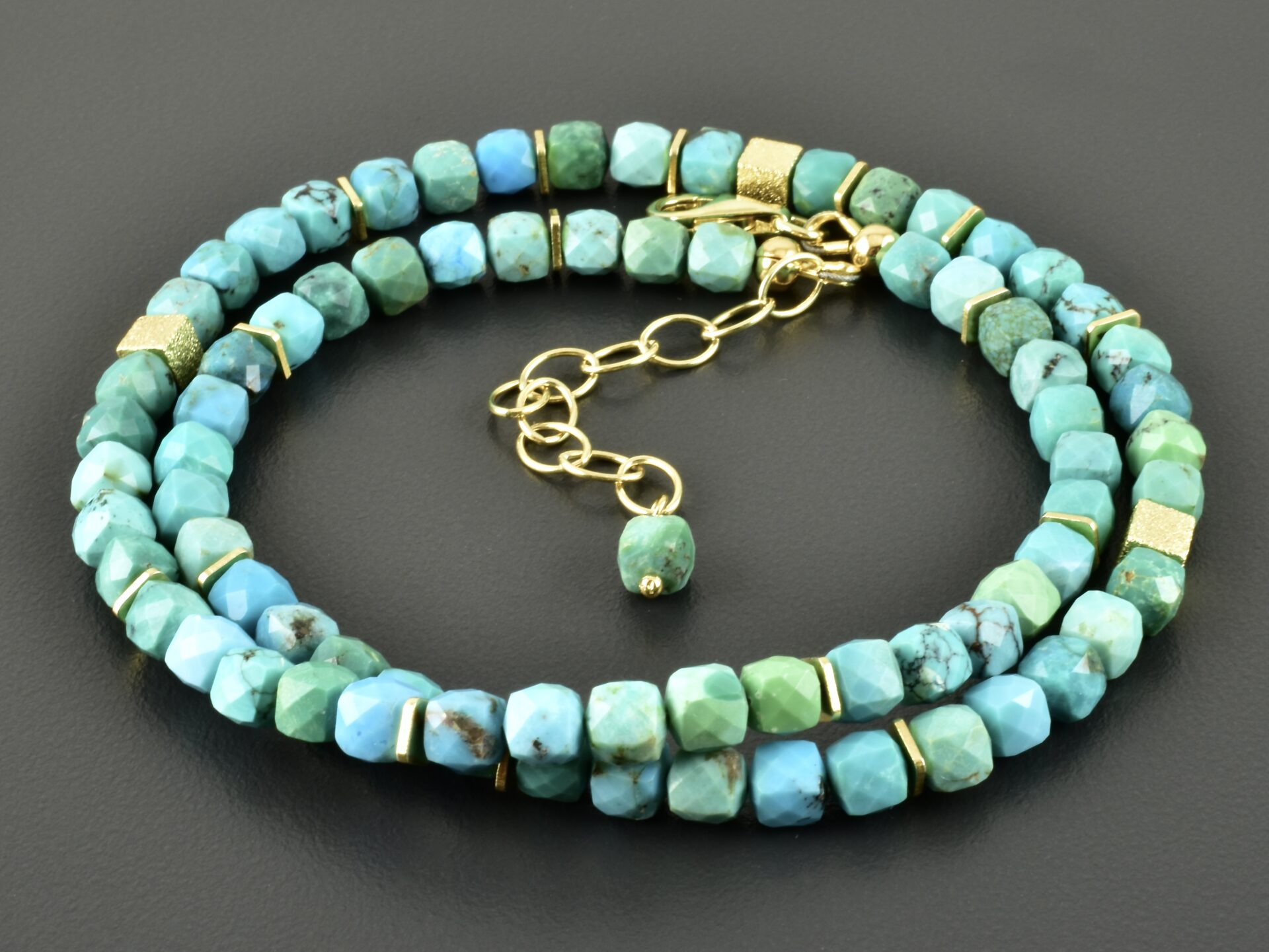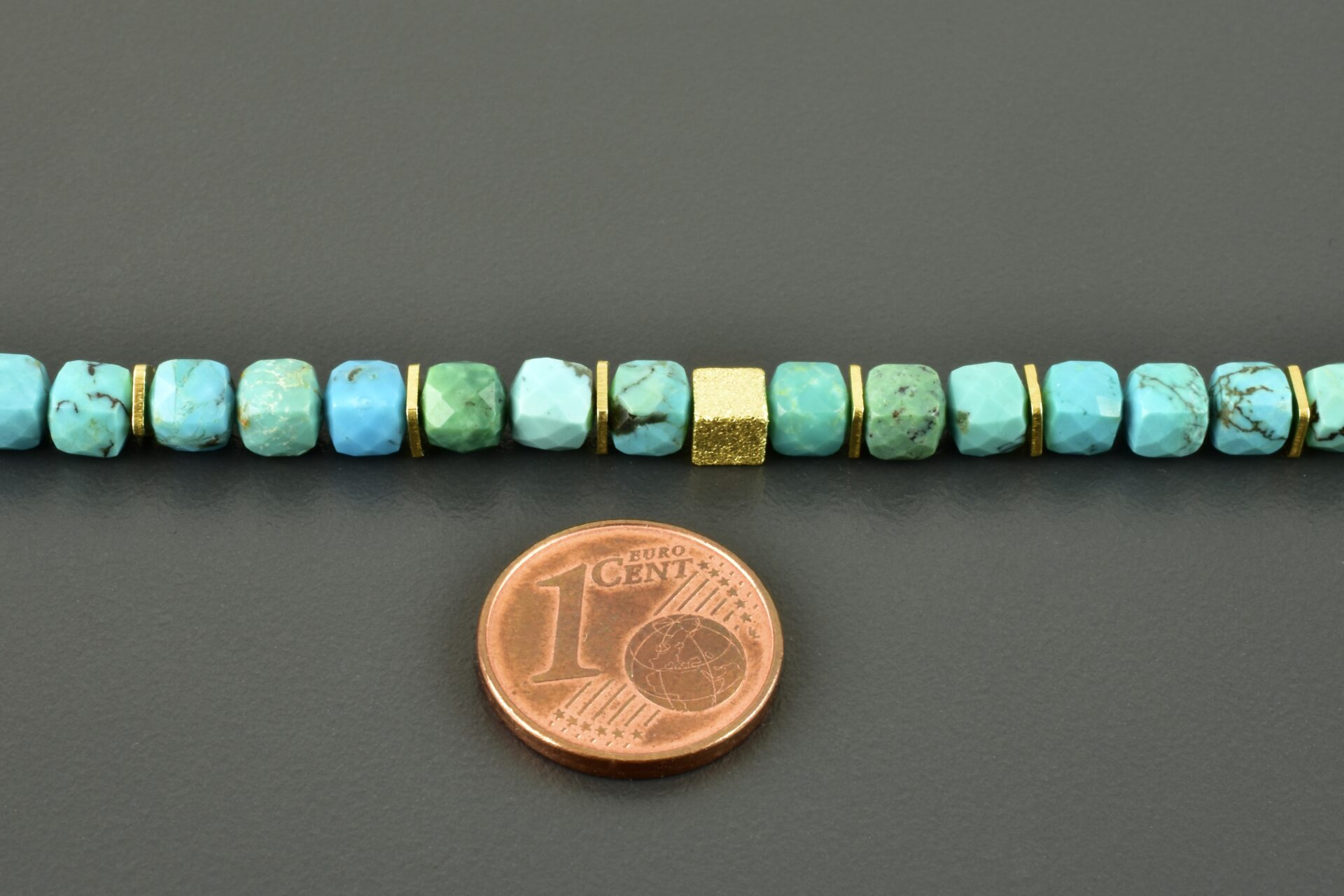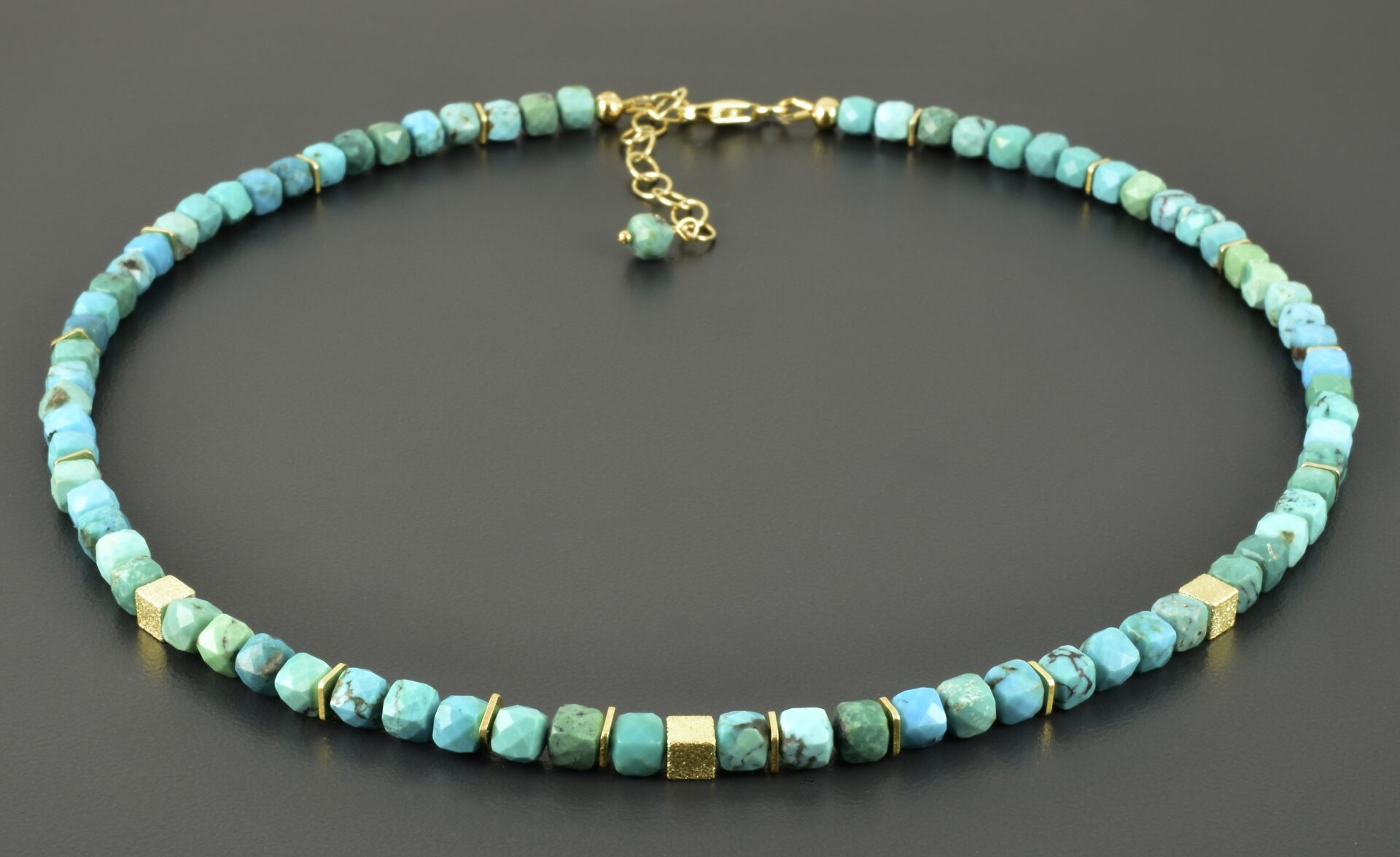 Die facettierten Türkiswürfel sind 4 mm groß. Ich habe sie mit viereckigen vergoldeten Scheiben kombiniert. Sie wurden regelmäßig über die Halskette verteilt. Zusätzlich sind drei der edlen vergoldeten Würfel im vorderen Bereich.