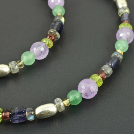 Für diese Kette habe ich Peridot- und Turmalinlinsen und Citrinscheiben verwendet, facettierter Granat und Amethyst in 5 mm, Kugeln aus Labradorit und Aventurin ergänzen das Design.