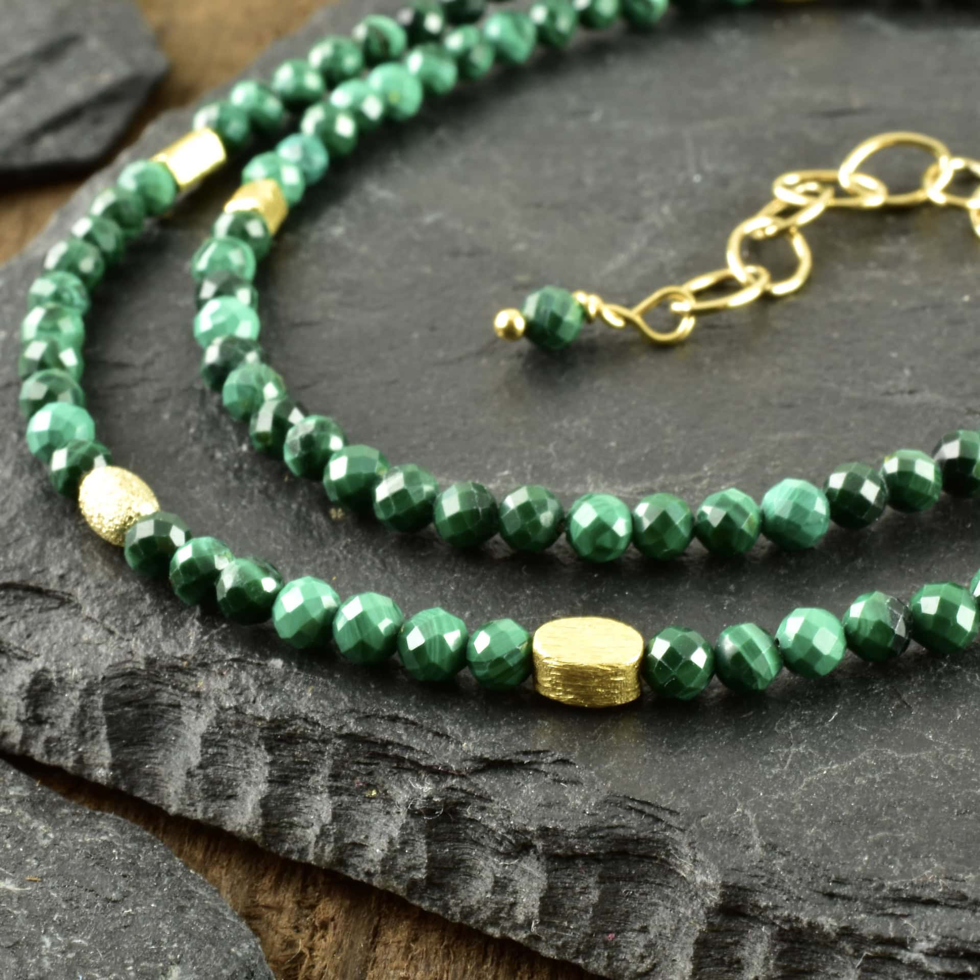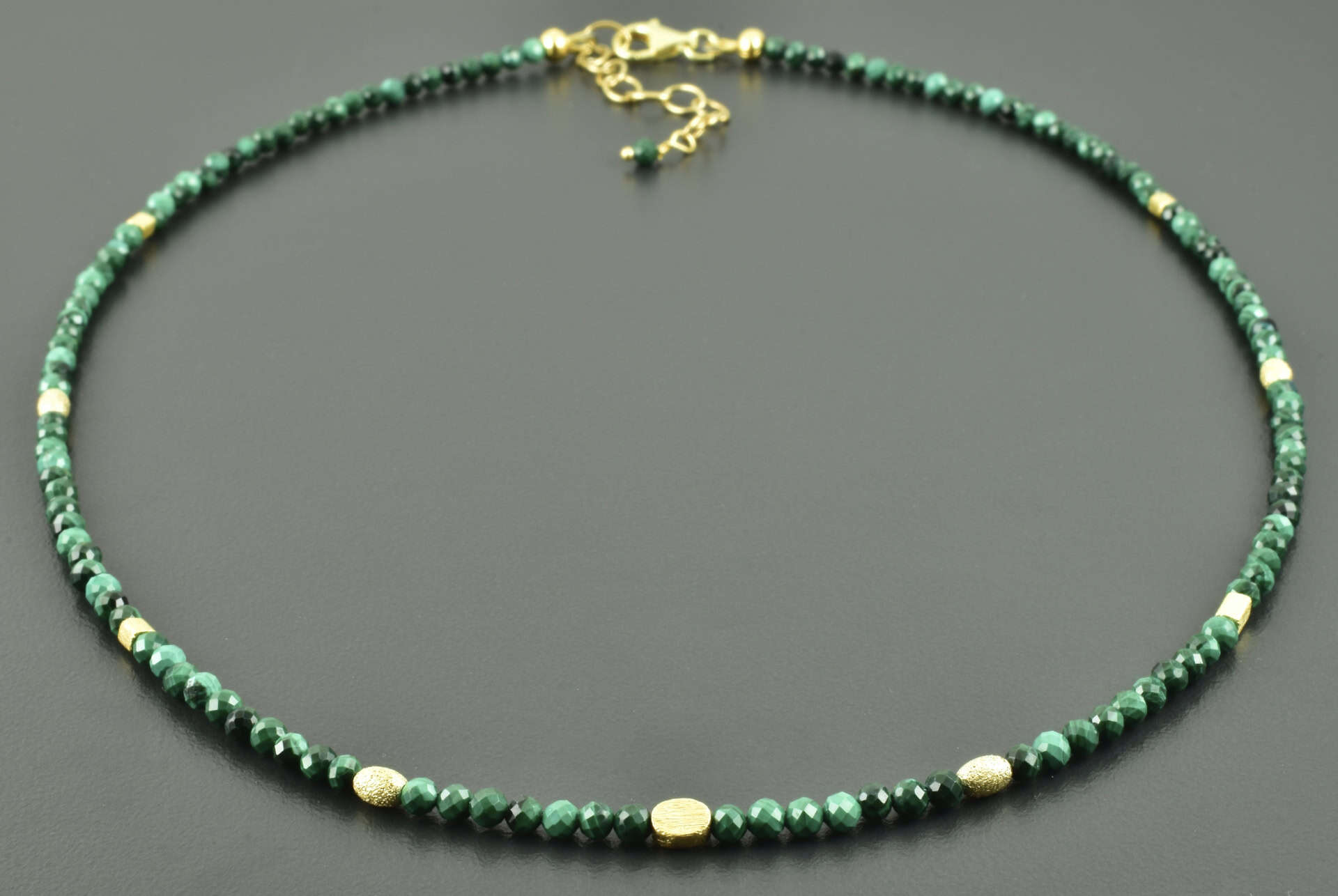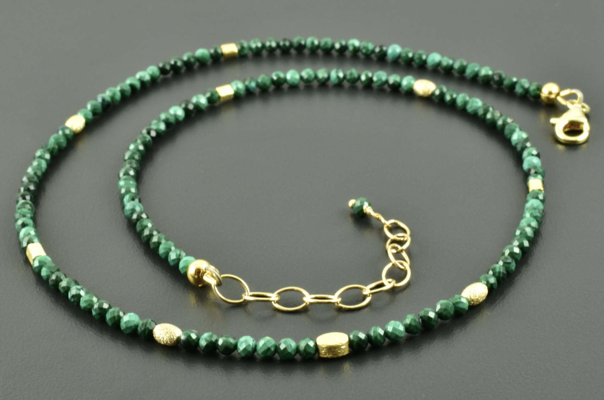 Diese zauberhaft zarte Halskette besteht aus kleinen, facettieren Malachitperlen. Sie haben eine wunderschöne intensive Farbe und sind 3 mm groß. Zwischen die Steine habe ich unterschiedliche Elemente aus matt vergoldetem 925er Silber gesetzt. Ich habe Rechtecke, Oliven und als zentralen Stein ein ovales Zwischenteil ausgesucht. Sie sind symmetrisch angeordnet.