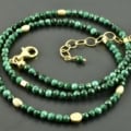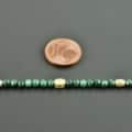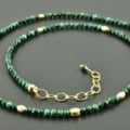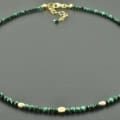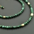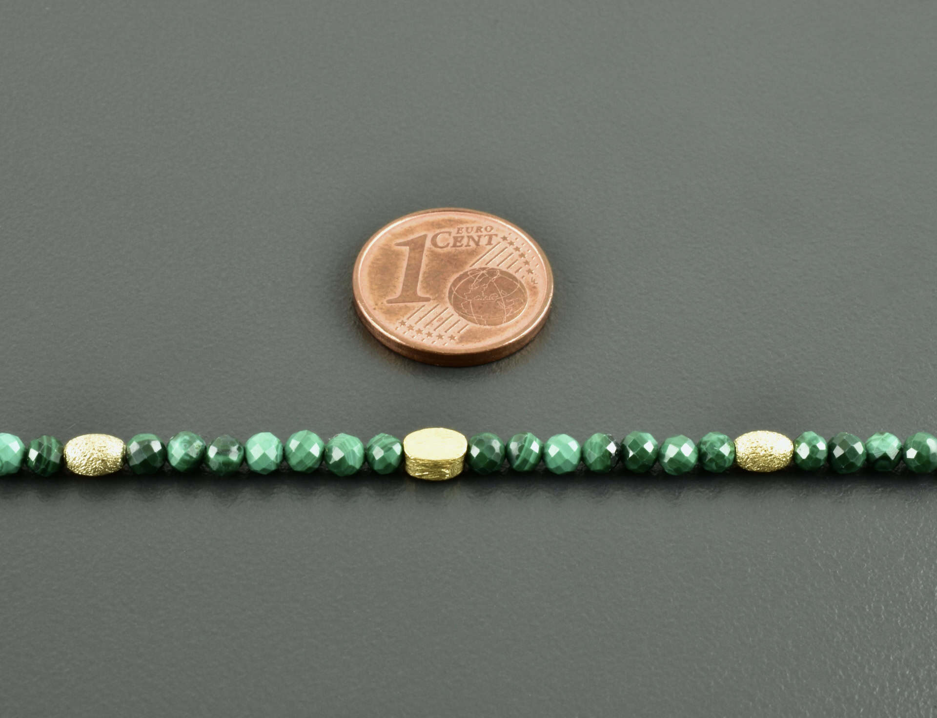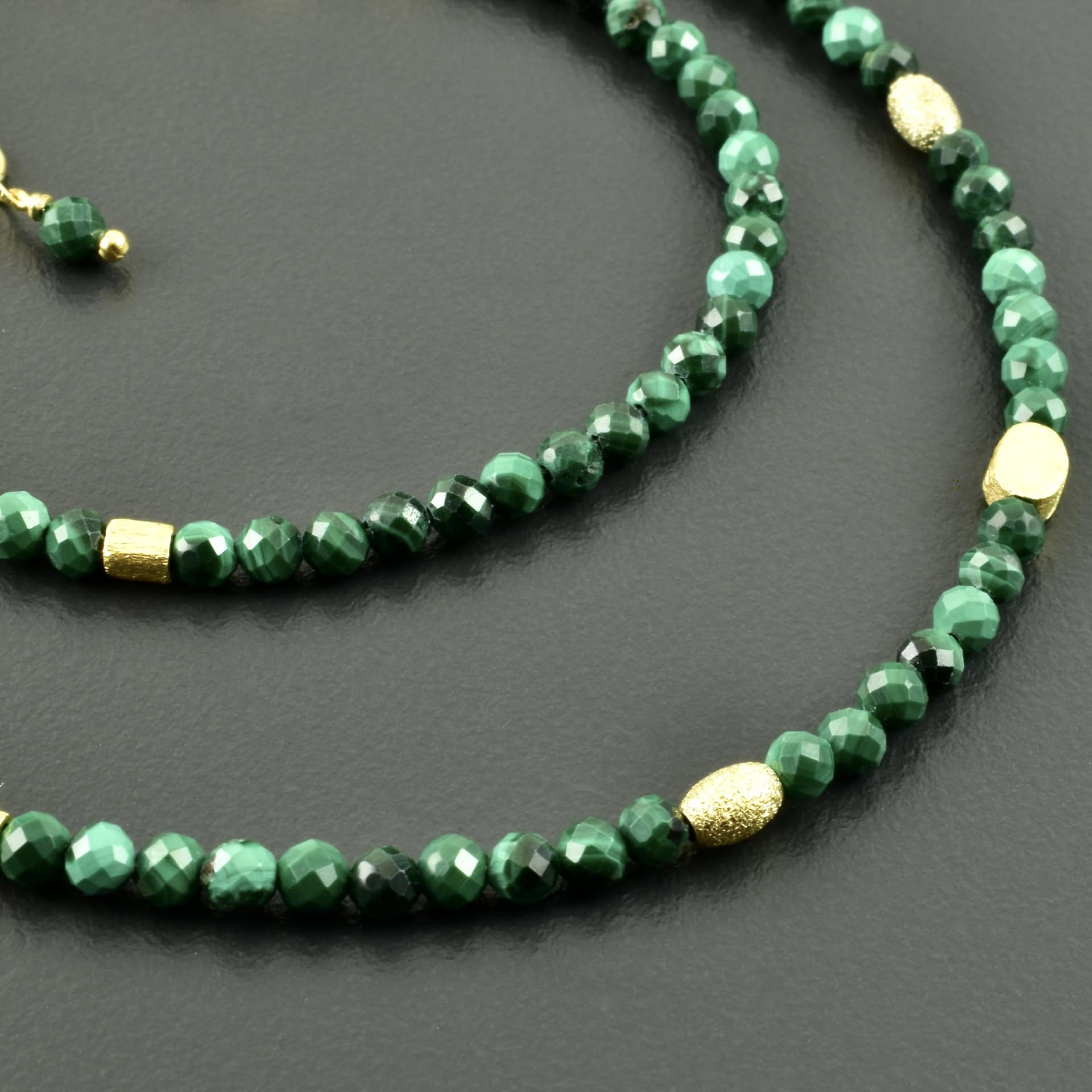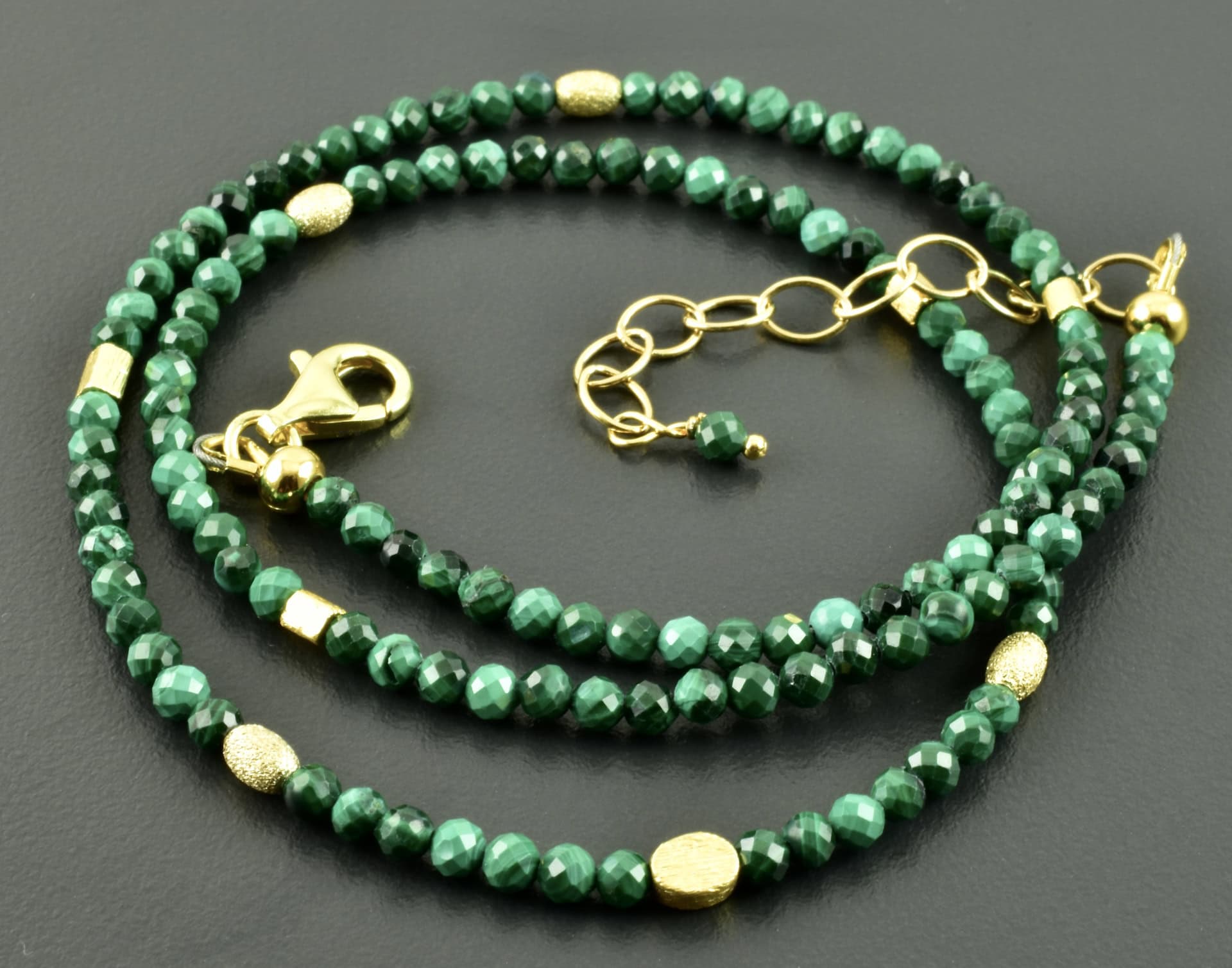 Diese zauberhaft zarte Halskette besteht aus kleinen, facettieren Malachitperlen. Sie haben eine wunderschöne intensive Farbe und sind 3 mm groß. Zwischen die Steine habe ich unterschiedliche Elemente aus matt vergoldetem 925er Silber gesetzt. Ich habe Rechtecke, Oliven und als zentralen Stein ein ovales Zwischenteil ausgesucht. Sie sind symmetrisch angeordnet.