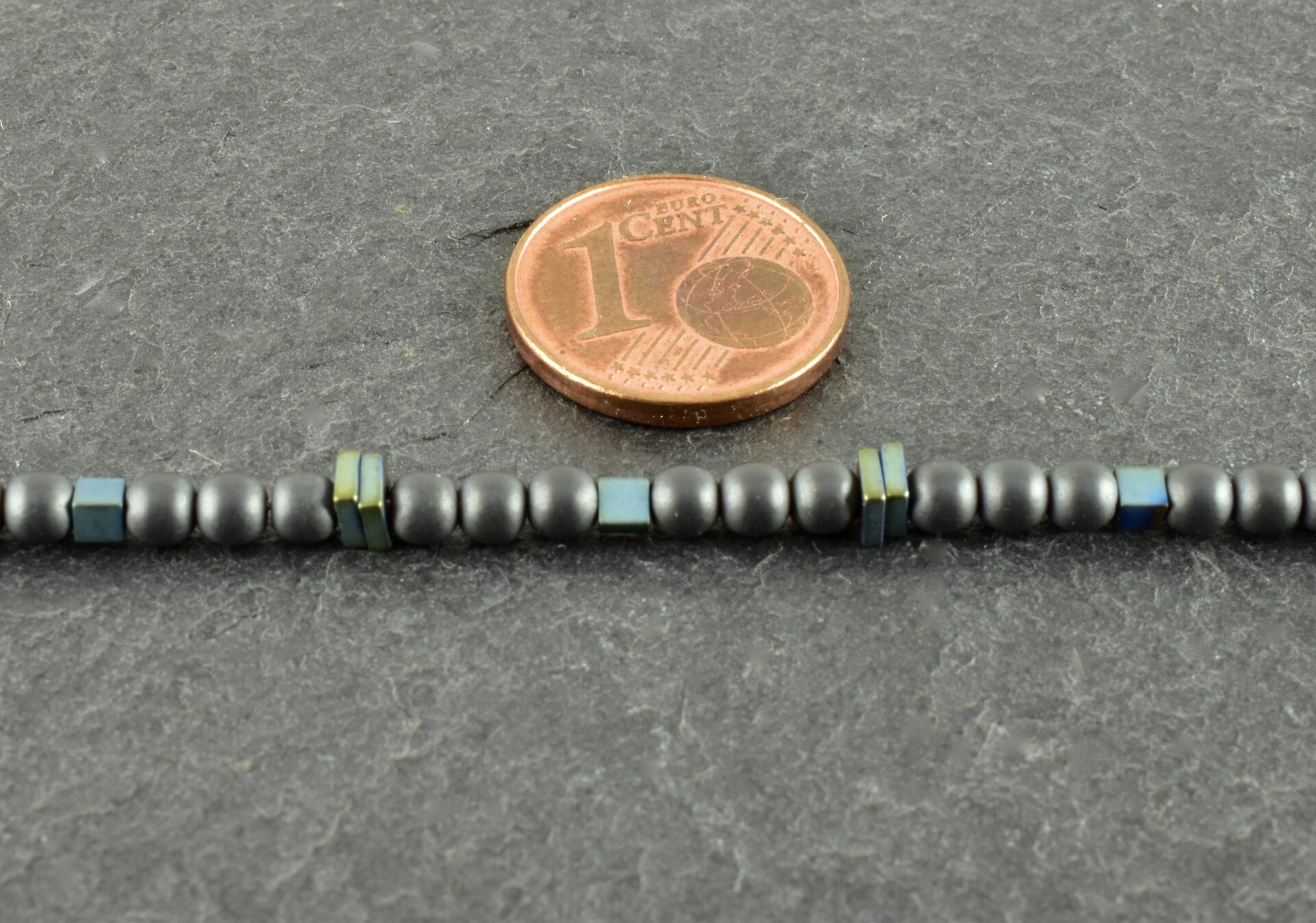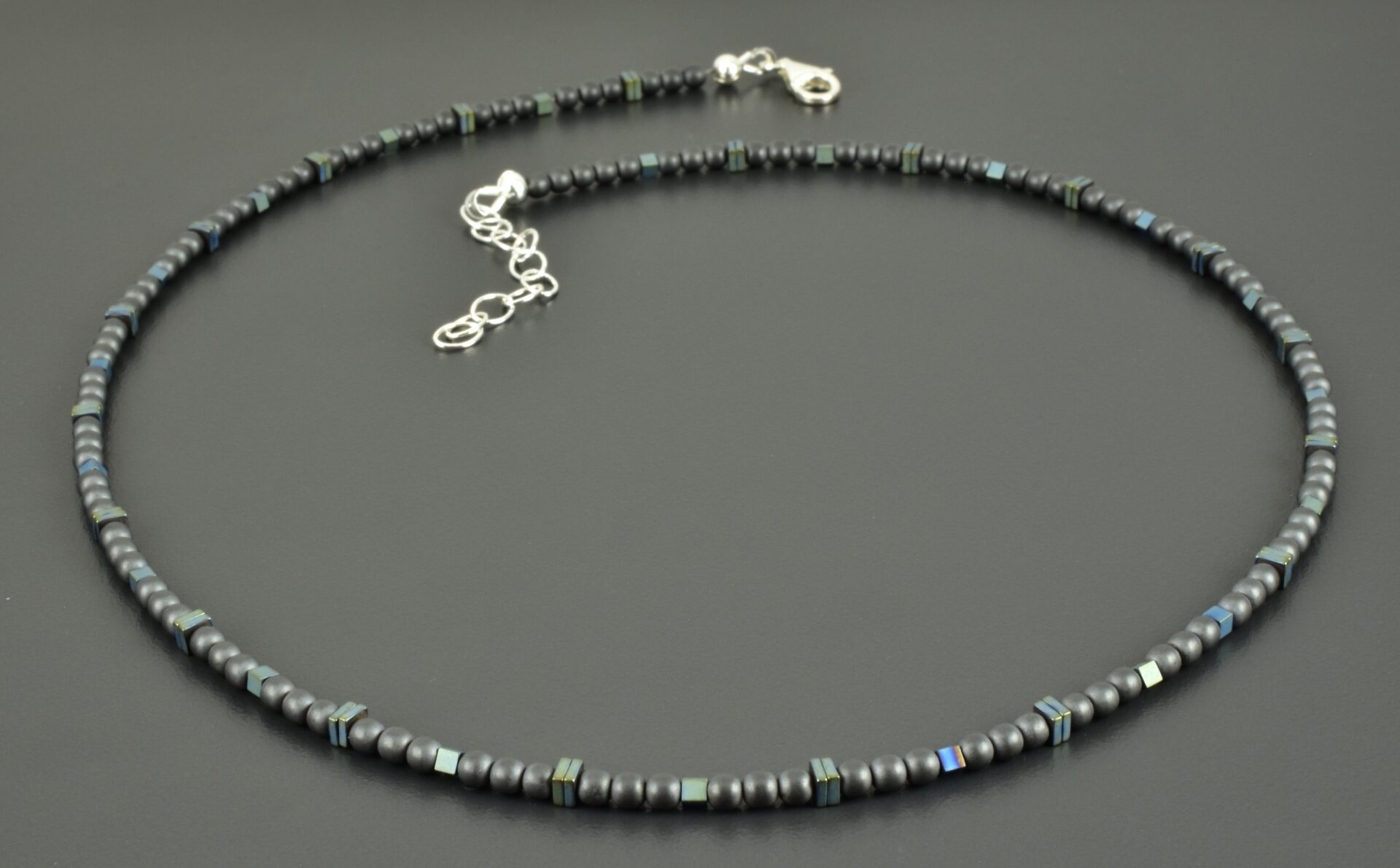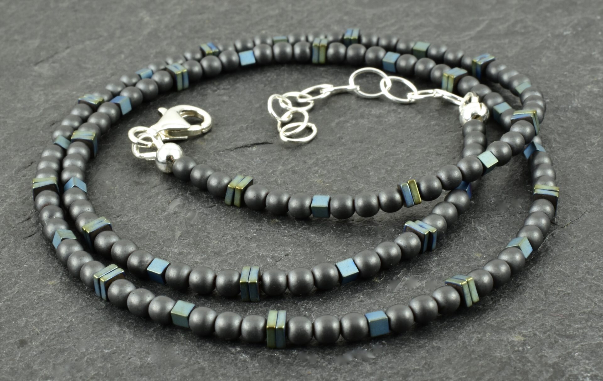 Drei Millimeter Hämatitkugeln, habe ich mit kleinen Würfeln und viereckigen Scheiben aus Hämatit kombiniert. Die Kugeln sind anthrazit, die Würfel und Scheiben wurden behandelt, sodass sie diese interessante Farbe – einen grünlich-blauen Farbton – bekommen haben.
