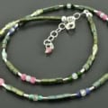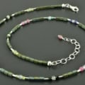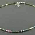 Kleine Hämatit-Rechtecke in 2,5 x 4 mm habe ich mit bunten Edelsteinwürfeln kombiniert. Der Hämatit wurde galvanisiert, sodass er diese interessante grün-blaue Farbe bekommen hat. In regelmäßigen Abständen wurden kleine, facettierte Würfel aus Labradorit, Turmalin, Peridot, Chrysokoll und Sodalith zwischen den Hämatit gesetzt. Zierliche Röhrchen aus 925er Silber begrenzen die farbigen Steine. Eine schöne Halskette für jeden Tag, oder natürlich auch für besondere Anlässe.