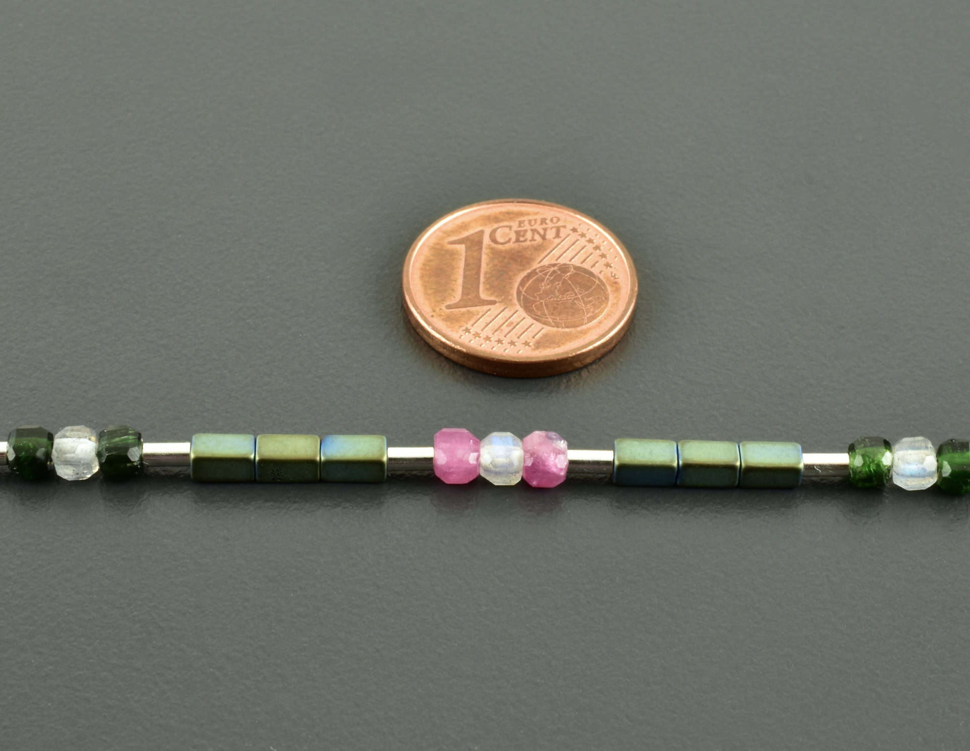 Kleine Hämatit-Rechtecke in 2,5 x 4 mm habe ich mit bunten Edelsteinwürfeln kombiniert. Der Hämatit wurde galvanisiert, sodass er diese interessante grün-blaue Farbe bekommen hat. In regelmäßigen Abständen wurden kleine, facettierte Würfel aus Labradorit, Turmalin, Peridot, Chrysokoll und Sodalith zwischen den Hämatit gesetzt. Zierliche Röhrchen aus 925er Silber begrenzen die farbigen Steine. Eine schöne Halskette für jeden Tag, oder natürlich auch für besondere Anlässe.