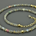 Der Labradorit wird von vergoldeten 925er Silberscheiben, runden Scheiben aus Aquamarin und Turmalin und quadratischen Smaragdscheiben unterbrochen. Mehr oder weniger mittig habe ich einen matt vergoldeten kleinen Würfel, eine Kugel und ein kleines Röhrchen eingefügt.